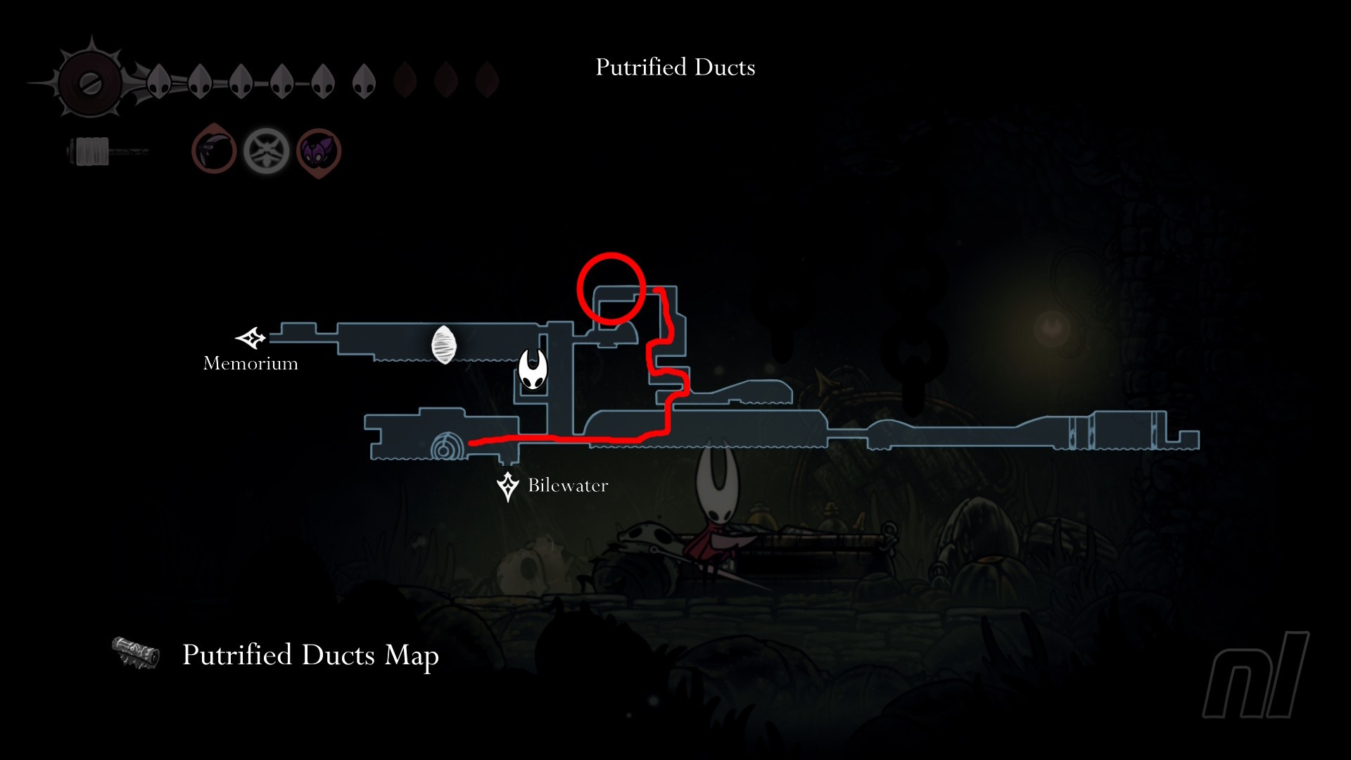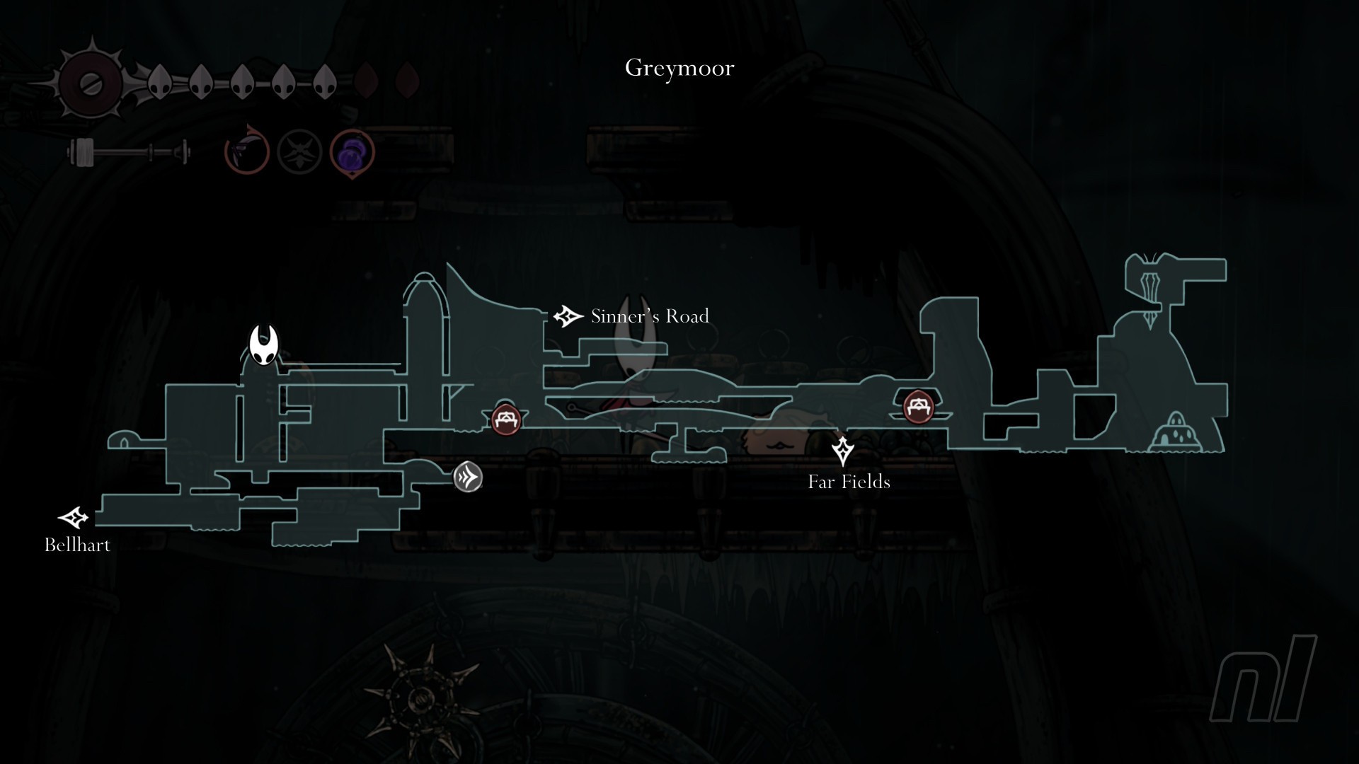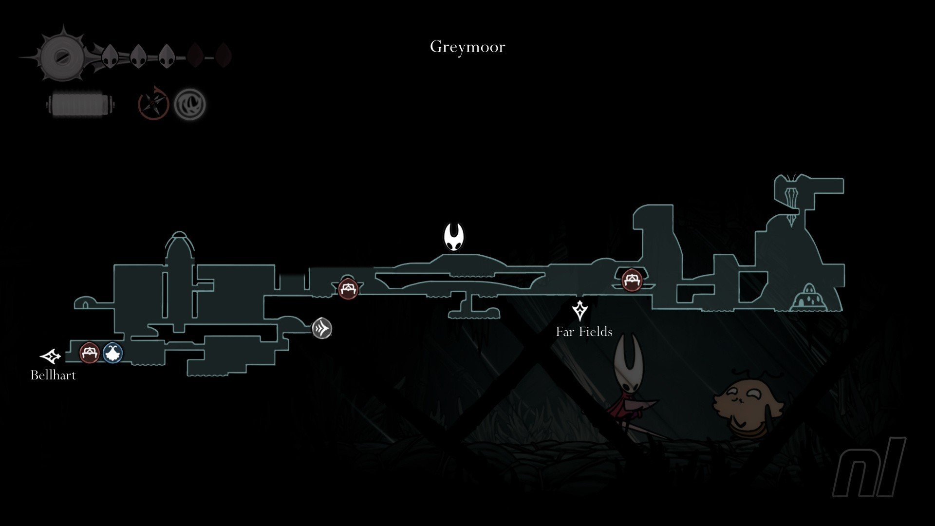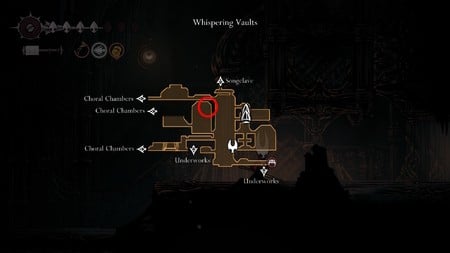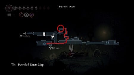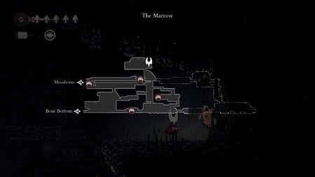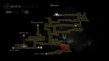 From the Bellway, hop back up the tall room and follow the path right. Keep going right for three rooms until you reach another tall room (not the huge one on the map above). Now drop down and again klook for that left nook for the room.