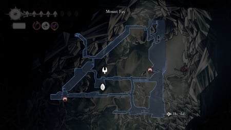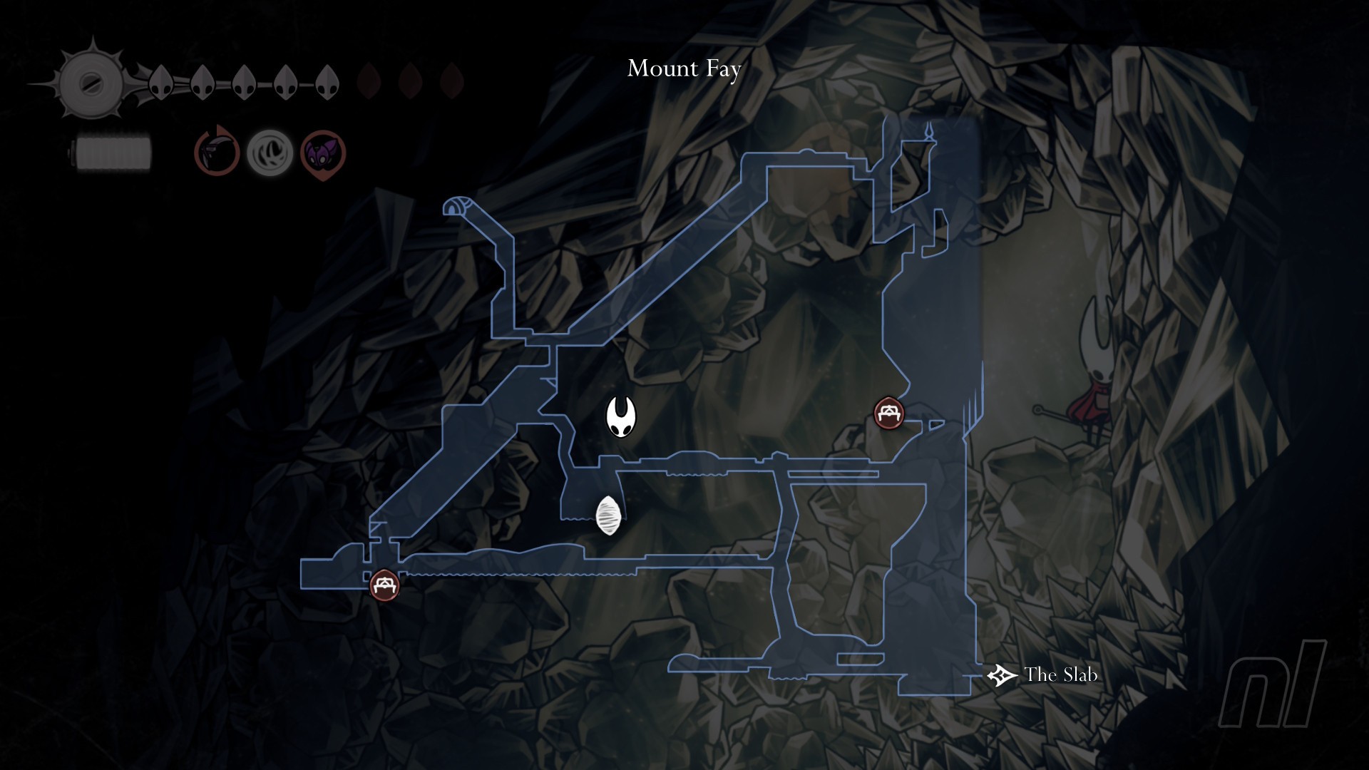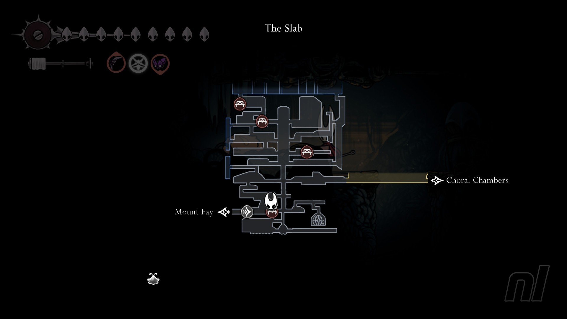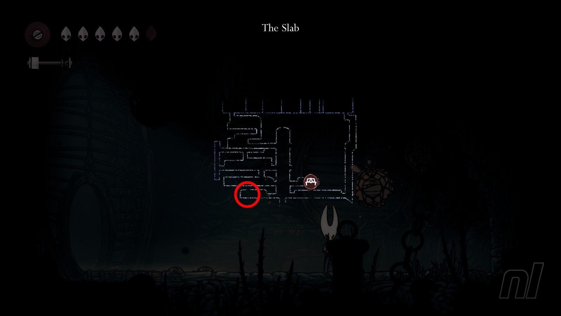 From the Bellway, hop back up the tall room and follow the path right. Keep going right for three rooms until you reach another tall room (not the huge one on the map above). Now drop down and again klook for that left nook for the room.