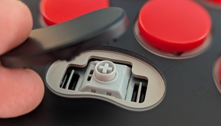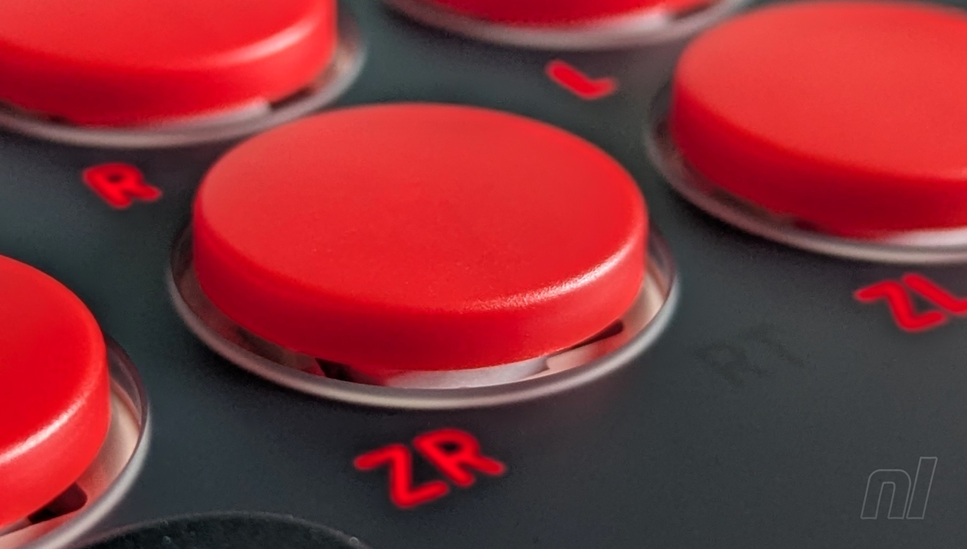 So let’s take a closer look at the buttons on this thing, starting with the standard circular inputs (we’ll come back to those bean-shaped ones shortly). These are your basic inputs, and their positioning on the controller is such that your fingers can rest comfortably across the majority of them. The black buttons represent your movement, with ‘left’, ‘right’, and ‘down’ grouped together, and ‘up’ situated down toward the bottom. The red buttons, meanwhile, are a mixture of the face buttons and shoulder buttons on a standard Switch Joy-Con or Pro Controller.