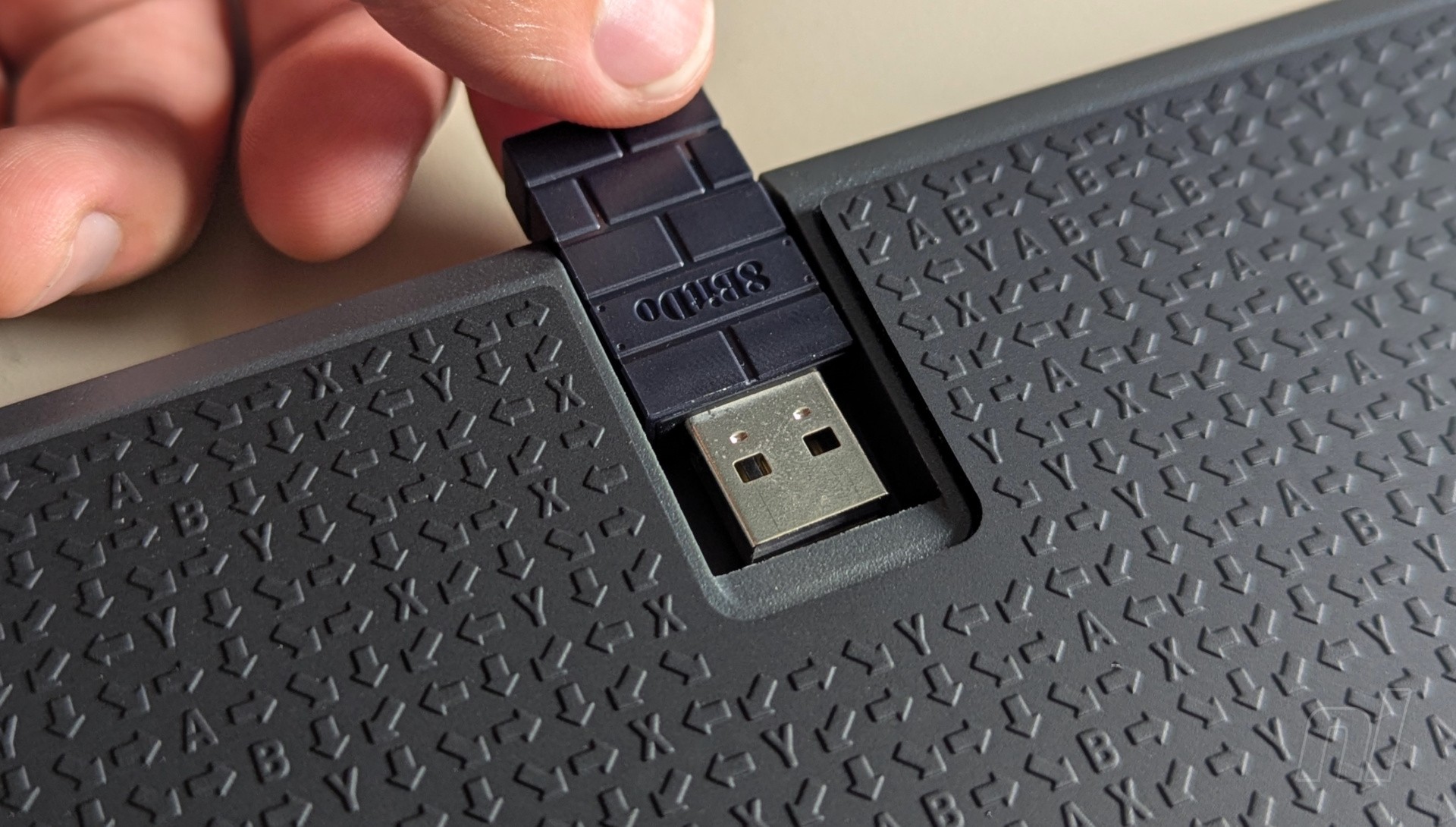 You’ll also find a couple of other notable features on the back of the device. First up is the USB dongle, and this is magnetic, so holding the dongle close will cause it to snap into place, and believe me, it’s surprisingly satisfying in practice.