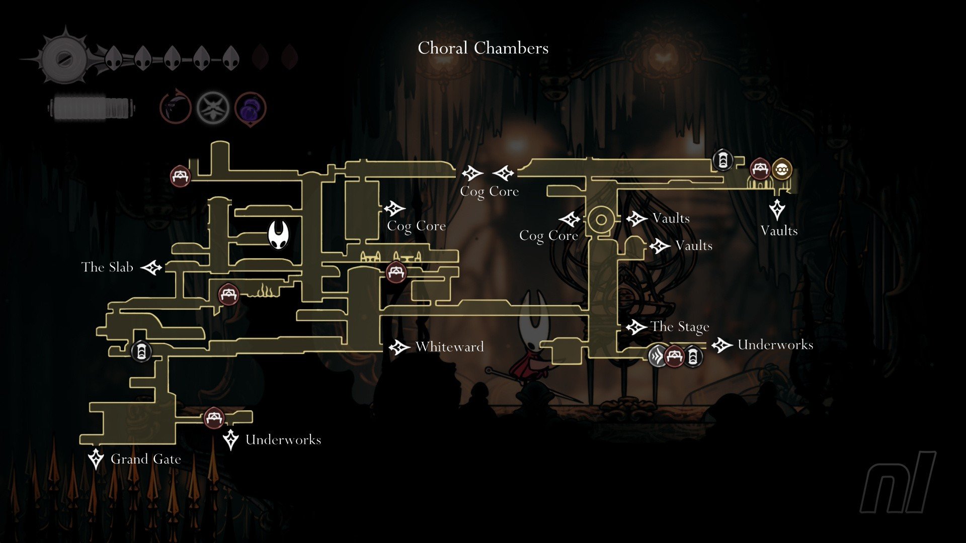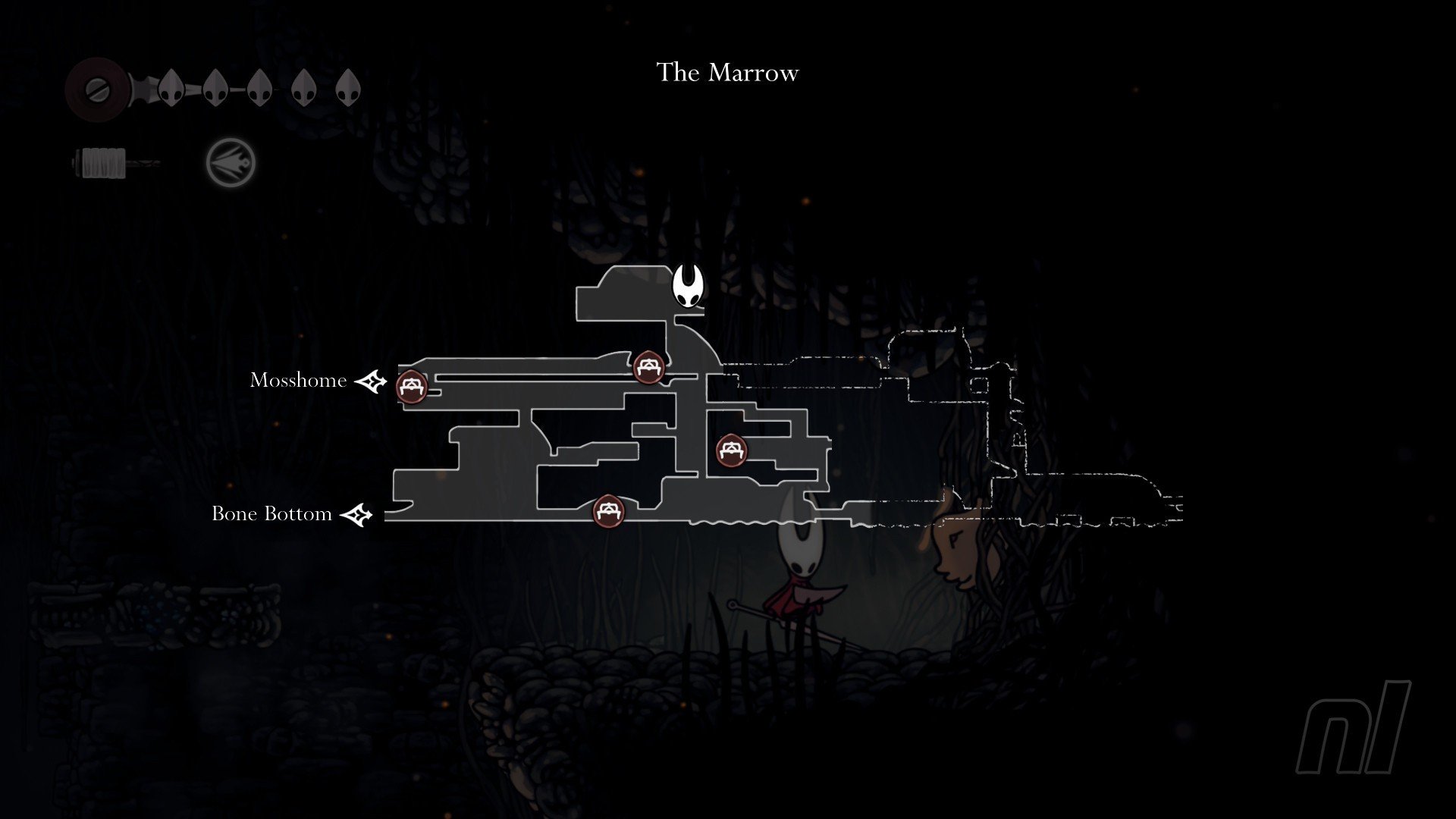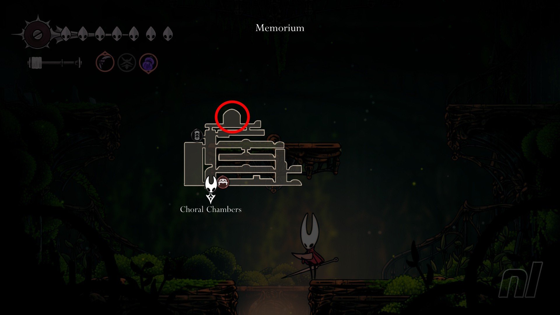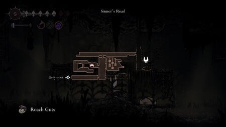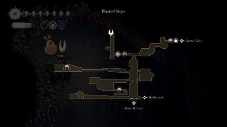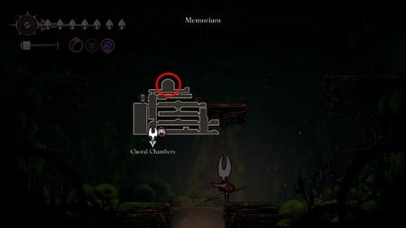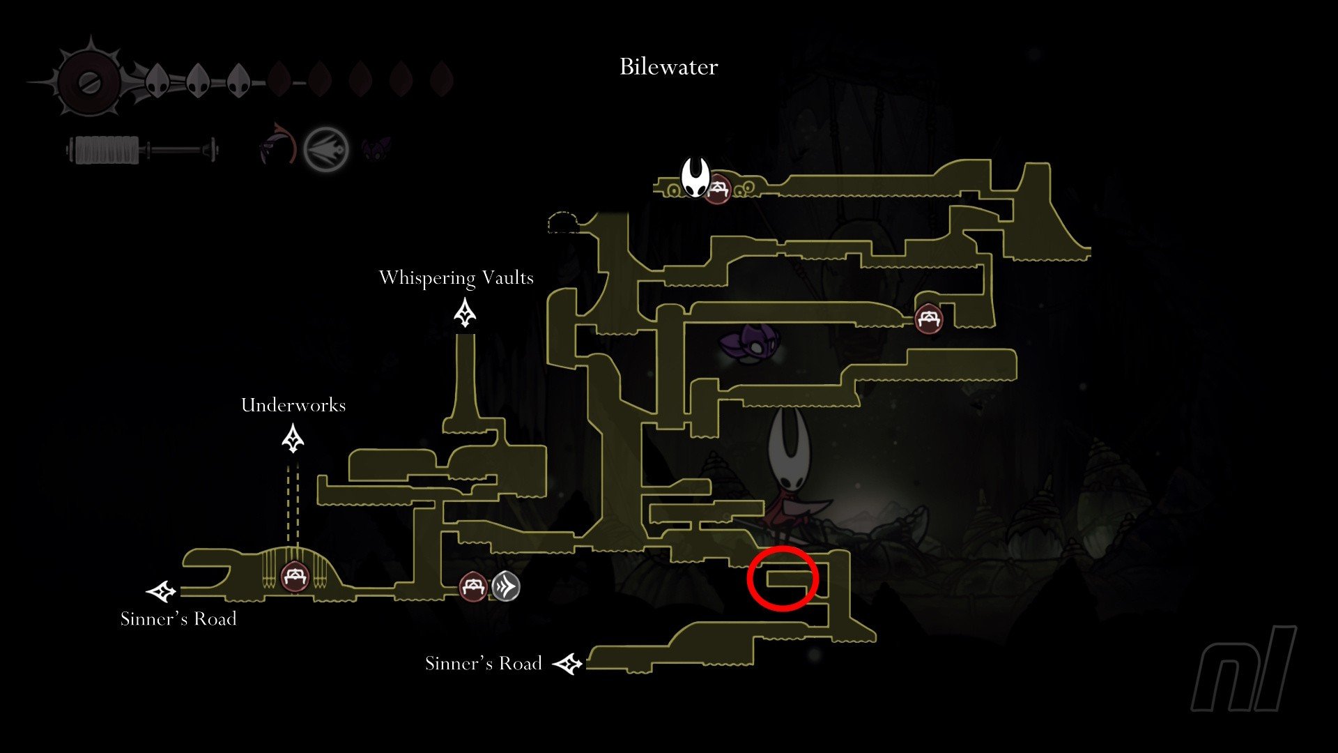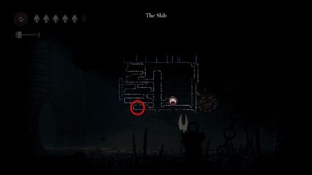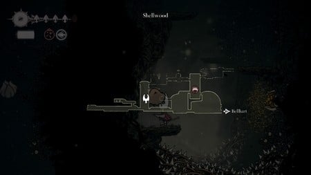 From the Bellway, hop back up the tall room and follow the path right. Keep going right for three rooms until you reach another tall room (not the huge one on the map above). Now drop down and again klook for that left nook for the room.