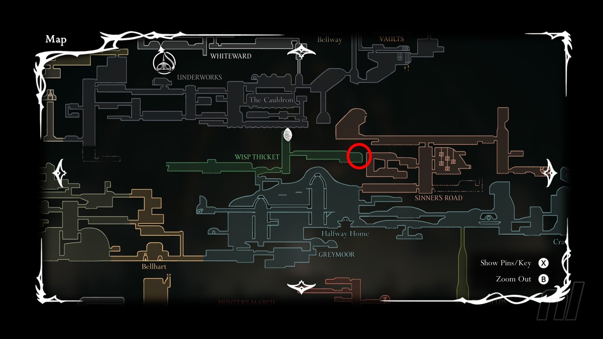 From the Bellway in Greymoor, head up the tower on the left of the map and climb to the very top (where you found a Flea earlier). In the top-left corner is a hidden pathway. Up here is the entrance to the Wisp Thicket.