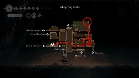 If coming from the Whispering Vaults, your path is a little longer. We recommend heading all the way to the Bellway so you have a bench — it's down four rooms from where you start, and then on the right when you reach a second tall room.