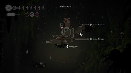 Simply make your way carefully through the worm-ridden passages, navigating down and left until you reach a tall room without any worms in it. Drop down and eventually you'll reach a switch. Hit it to create a shortcut back to Bone Bottom, but don't drop down. Break the wall on the right to enter a hidden room.