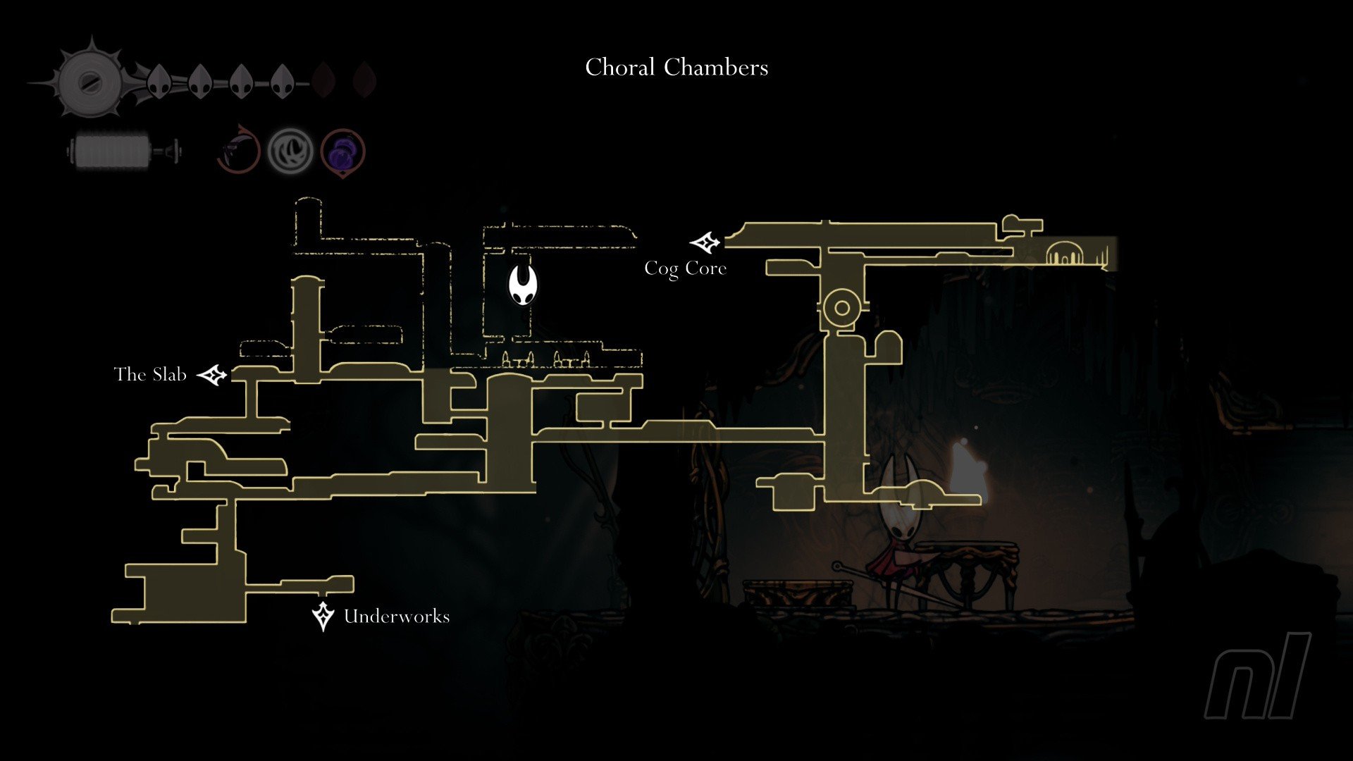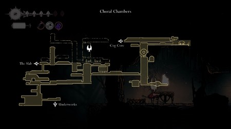 After you rest at the bench on the bottom half of Cogwork Core (the area you drop down into after the Cogwork Dancers boss), drop down on the left side carefully until you see an opening. Follow the path along here and eventually you'll reach the outside of a tall room in the Choral Chambers, and a Mask Shard