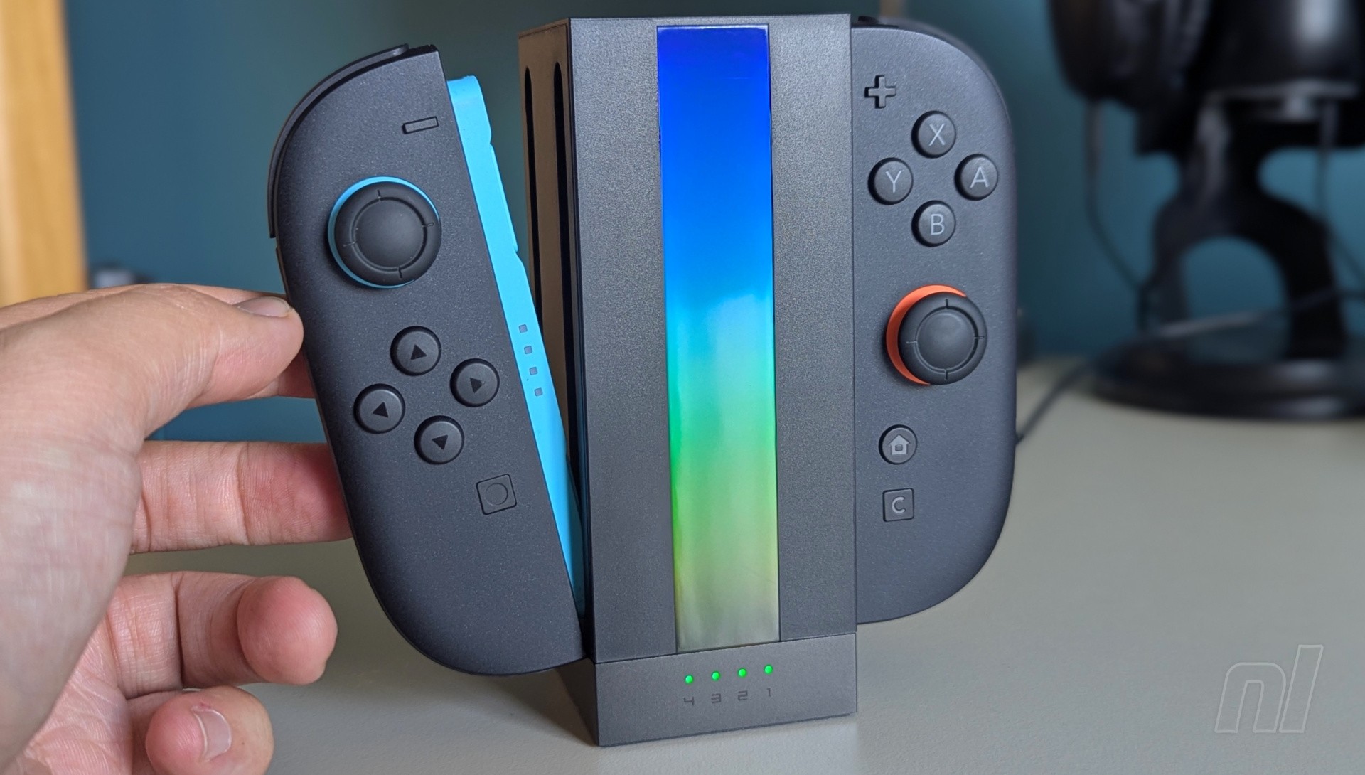 Green LEDs on the bottom of the device indicate which of the four slots is currently in use. By default, the lights will remain constant, but will start blinking when charging the Joy-Con. Once you’re fully charged, all lights will stay lit, so you’re good to remove them at this point.