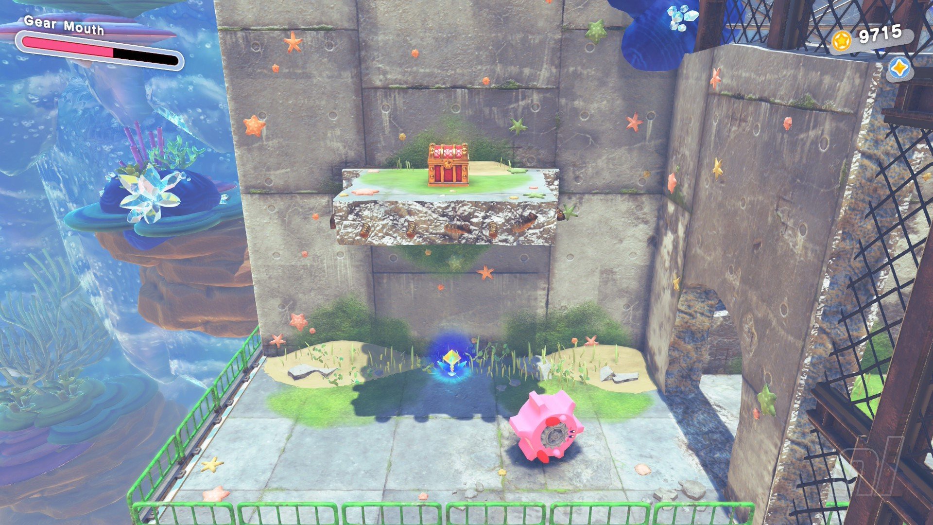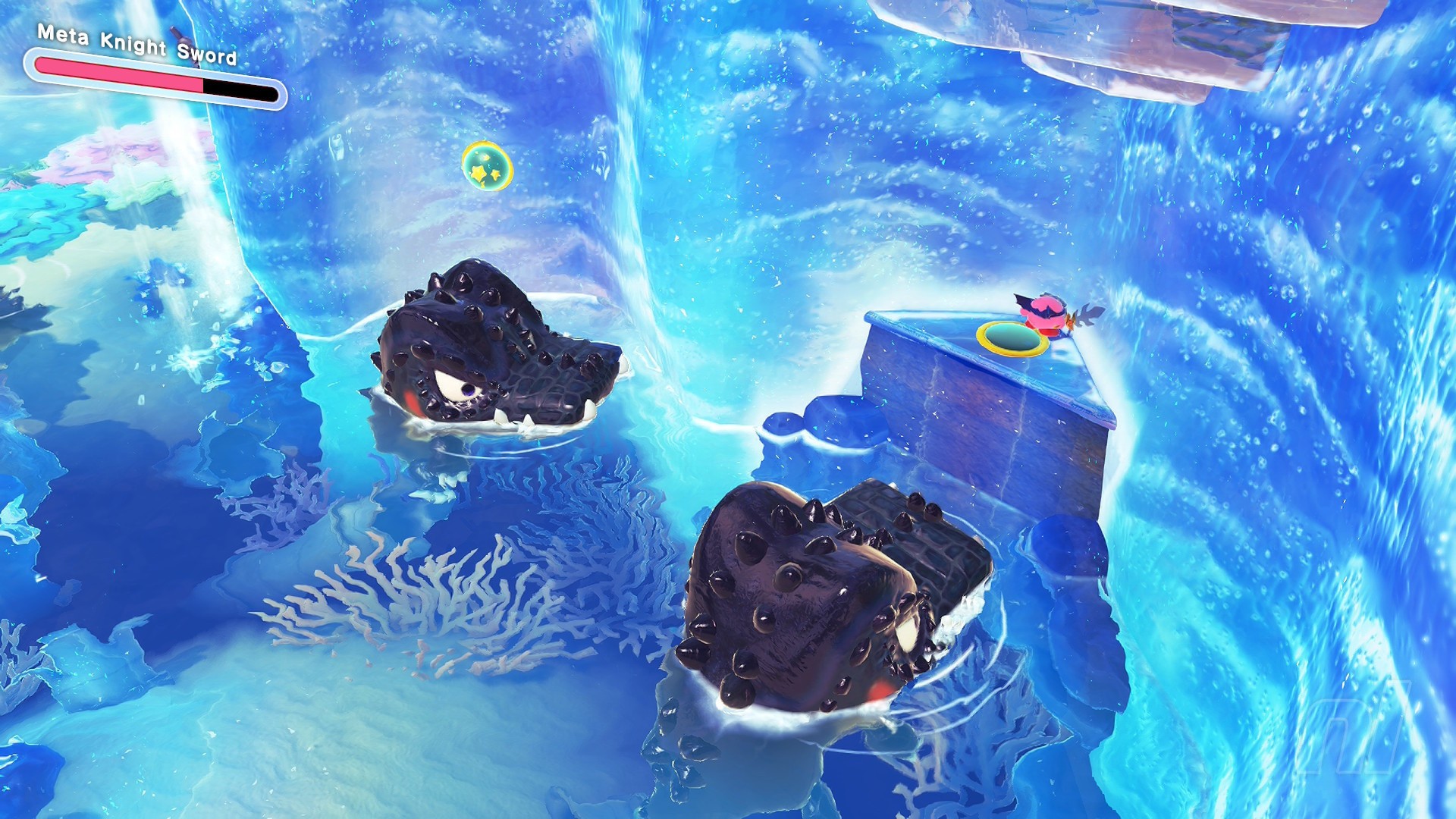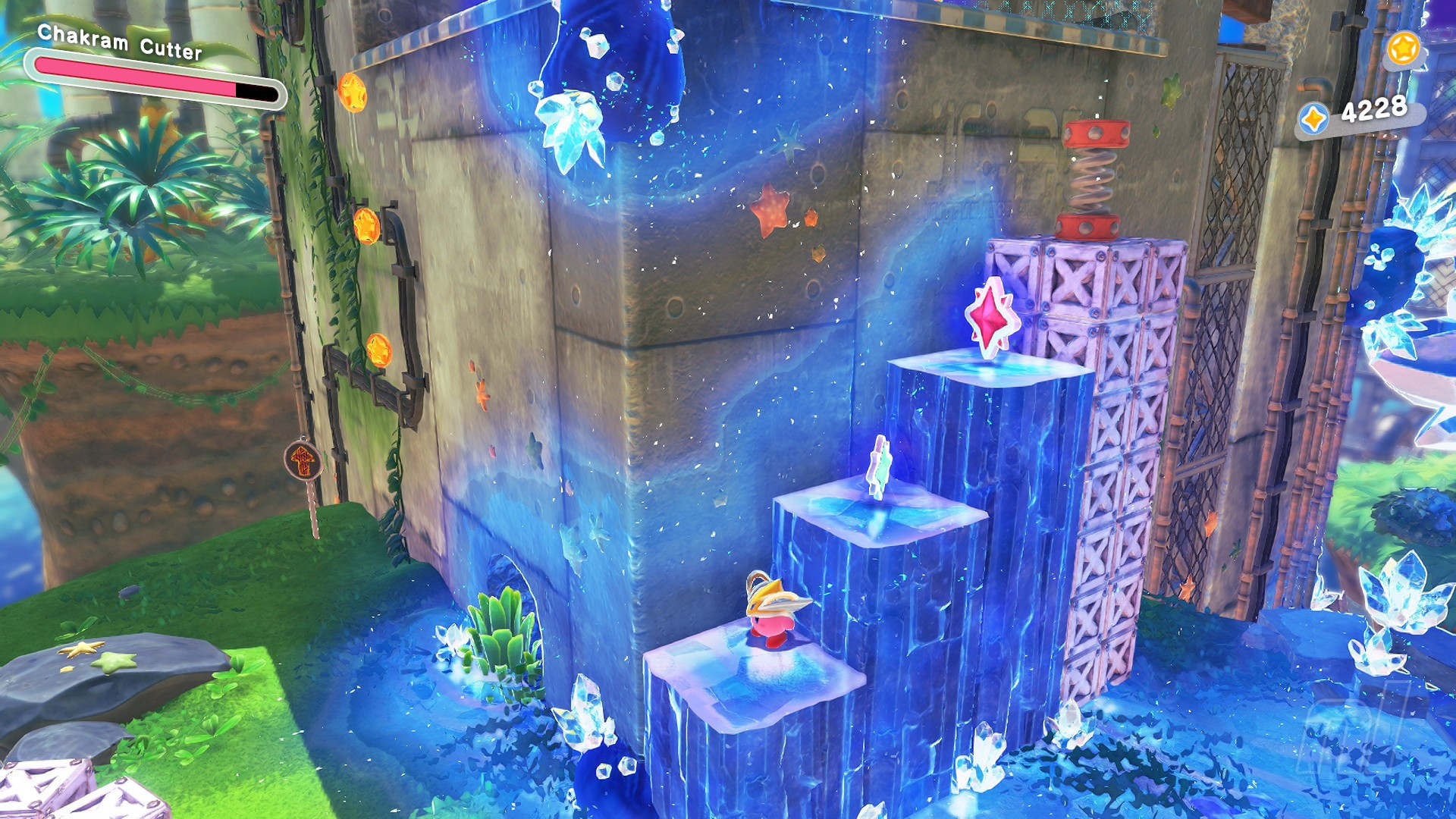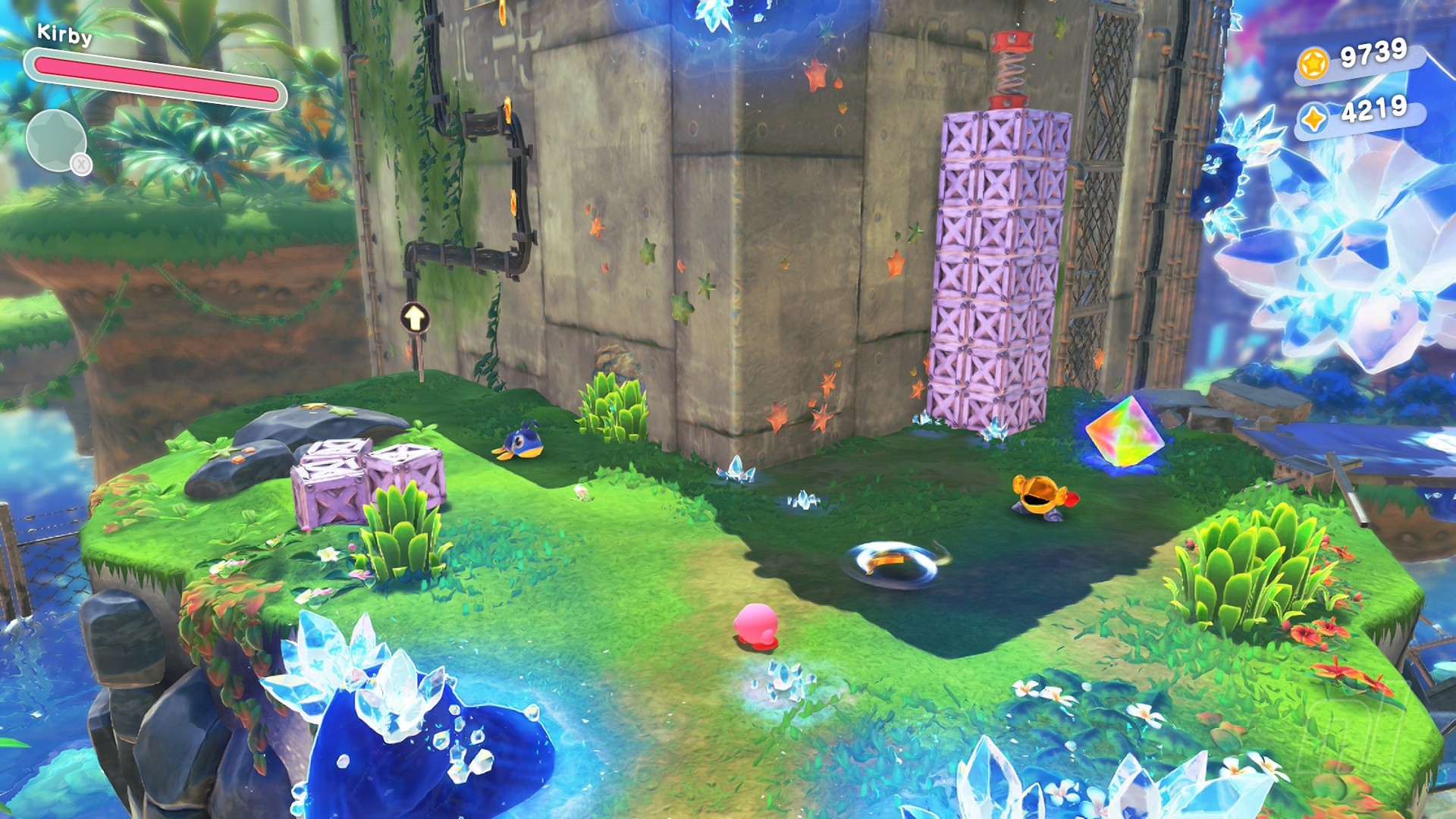 This Starry is right at the end of the level. Just before smashing the crystal at the end, turn back on yourself and find the switch hidden in the left corner. Now head up the ice ramp to find some cracked ground. Use cone mouth to clear this and nab the chest with your prize.