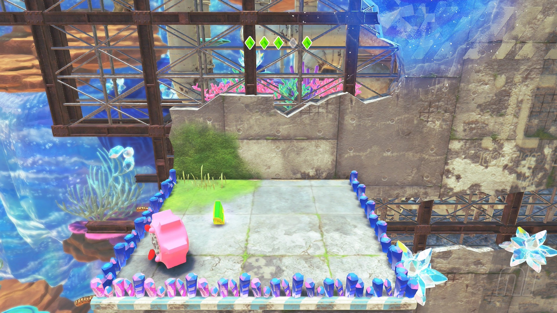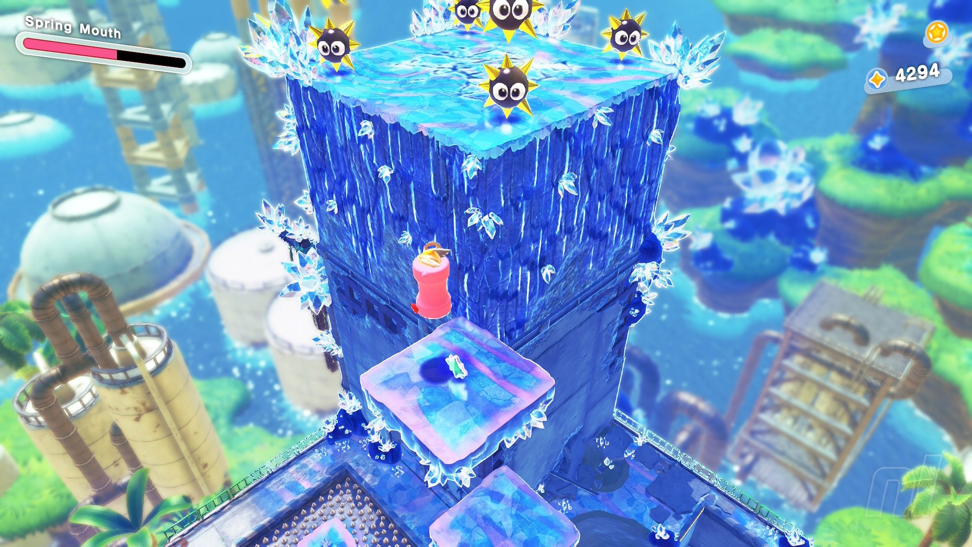 The first Starry is reached by making your way to the very top of the opening tower area. To do this, hit all of the switches you can see in this opening. You'll find one hidden at the base of the tower in some grass and a further few reveal themselves to the left of the area as you grab Spring-Mouth.