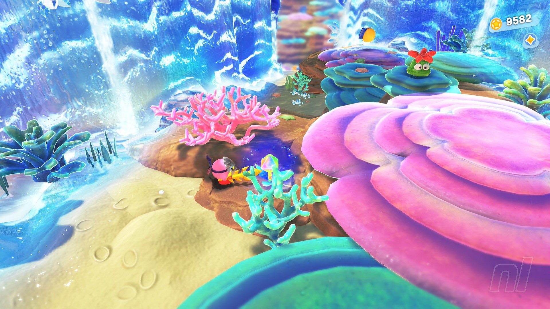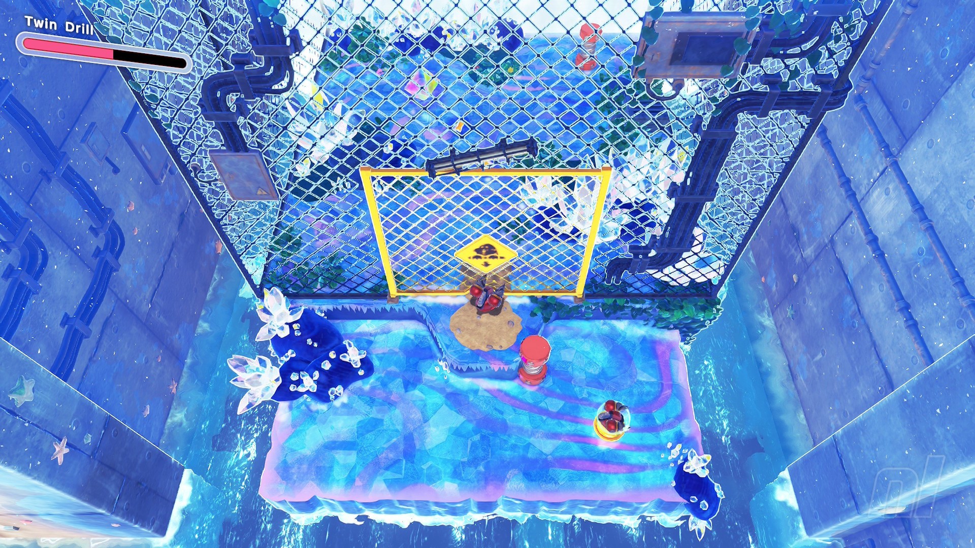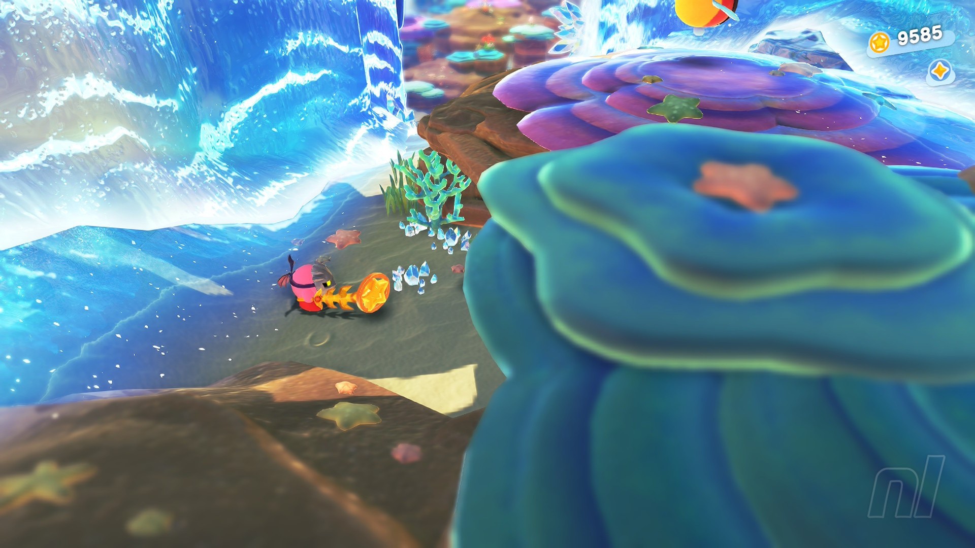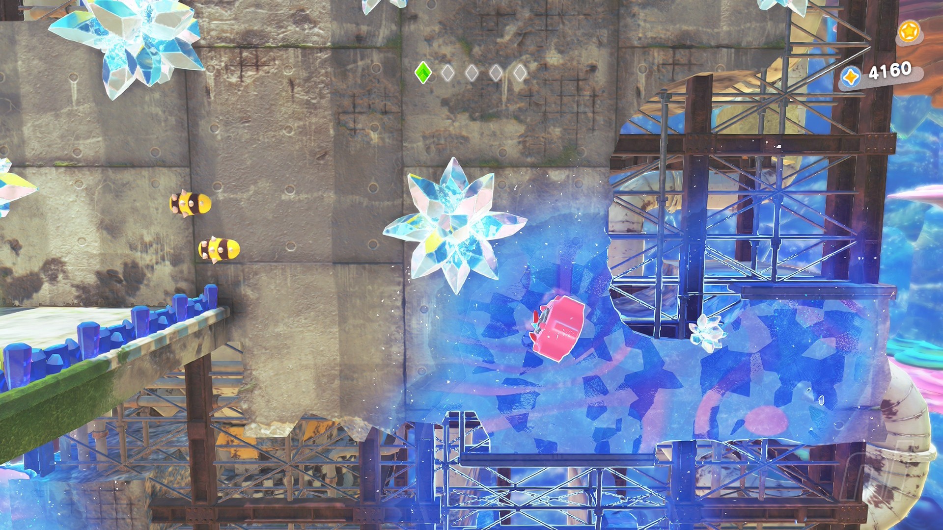 Once at the top, smash the ice to drop down into the waterworks. Here you need to gather up five orange pieces. To do this, simply move through the water tunnel switching crystals and using the water flumes to ride up onto platforms.