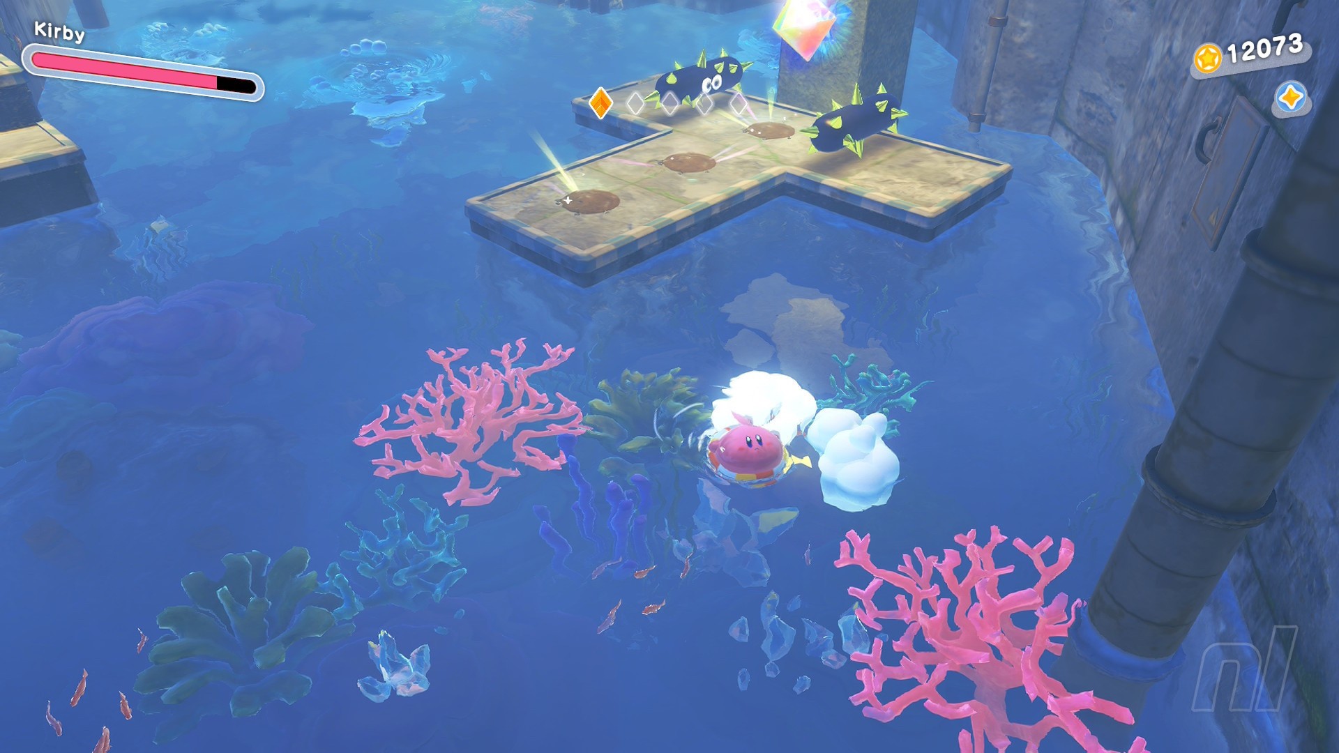 Still down in the waterworks, and you'll come to a battle with the ball-chucking seal from a little earlier. Now, the trick here is to do this scrap as Cone Mouth. Which, as it turns out, is quite easy!