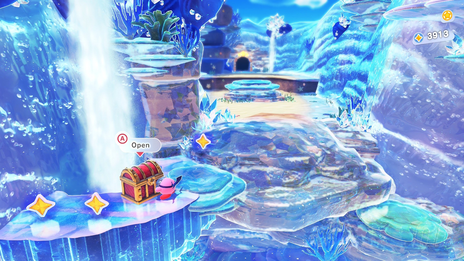 The first Starry is yours once you beat the ice crystal monster. Again! Follow the path up to gather your prize once the battle is done.