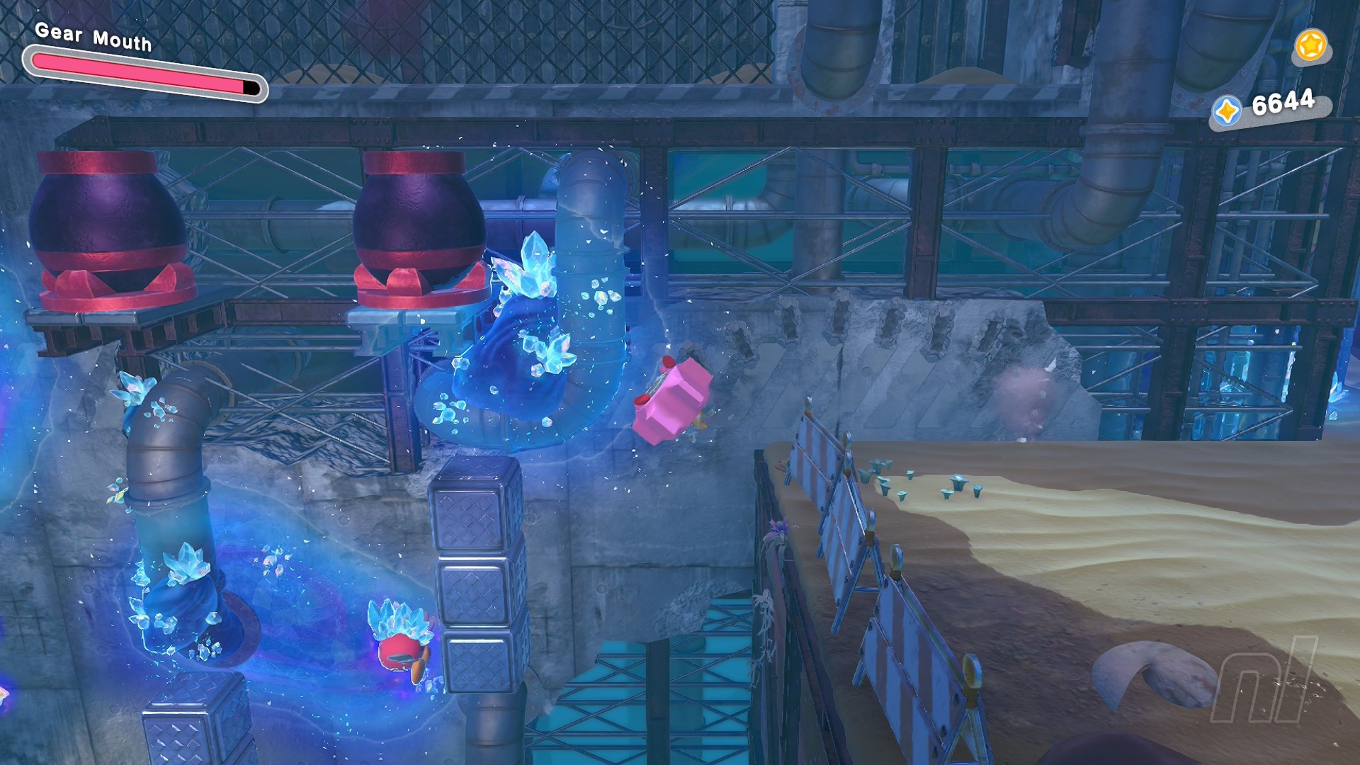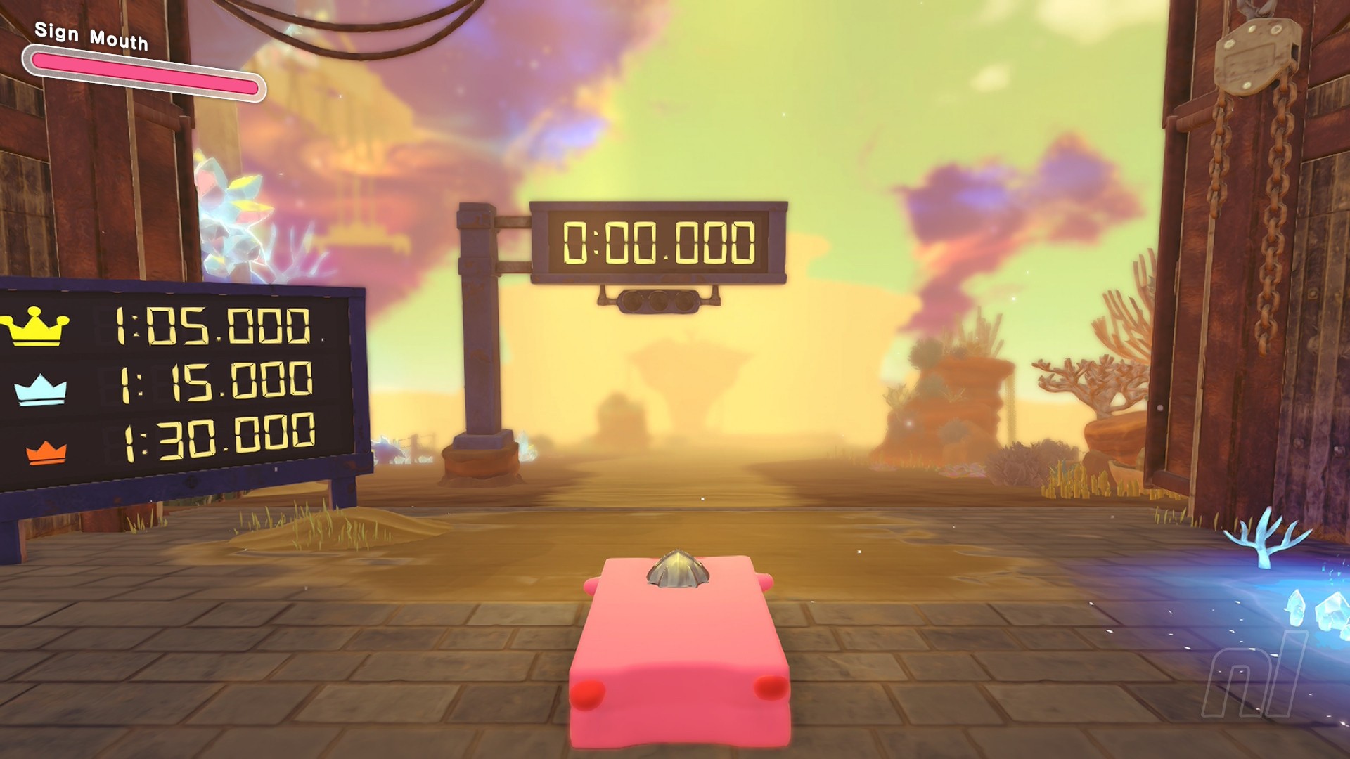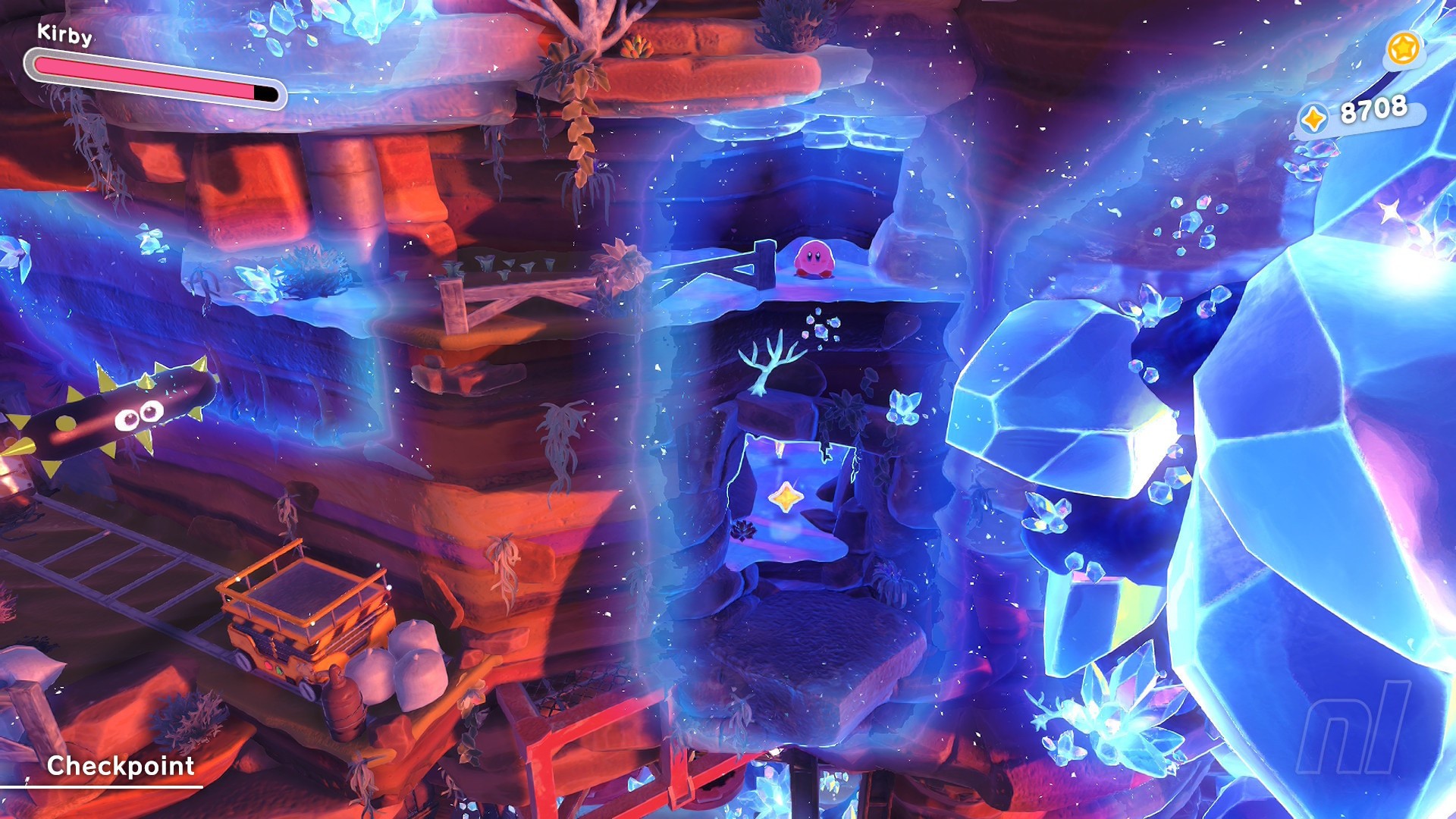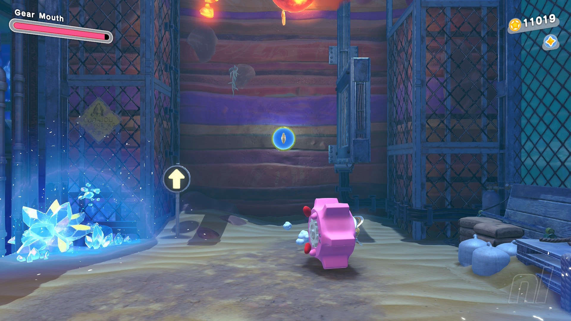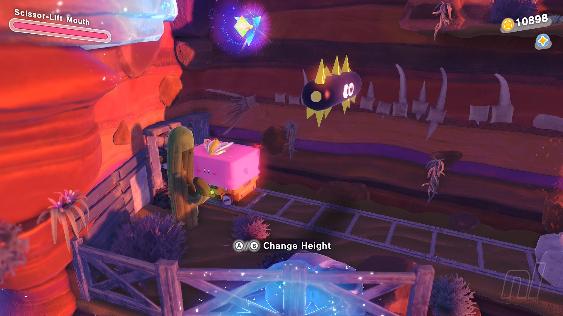 Our first Starry is found by using Kirby's scissor-lift mode to roll across and then jump up into a little nook that you'll find in a semi-hidden area. To reach here, make the initial ascent and do the timed challenge for the coins on the way up.