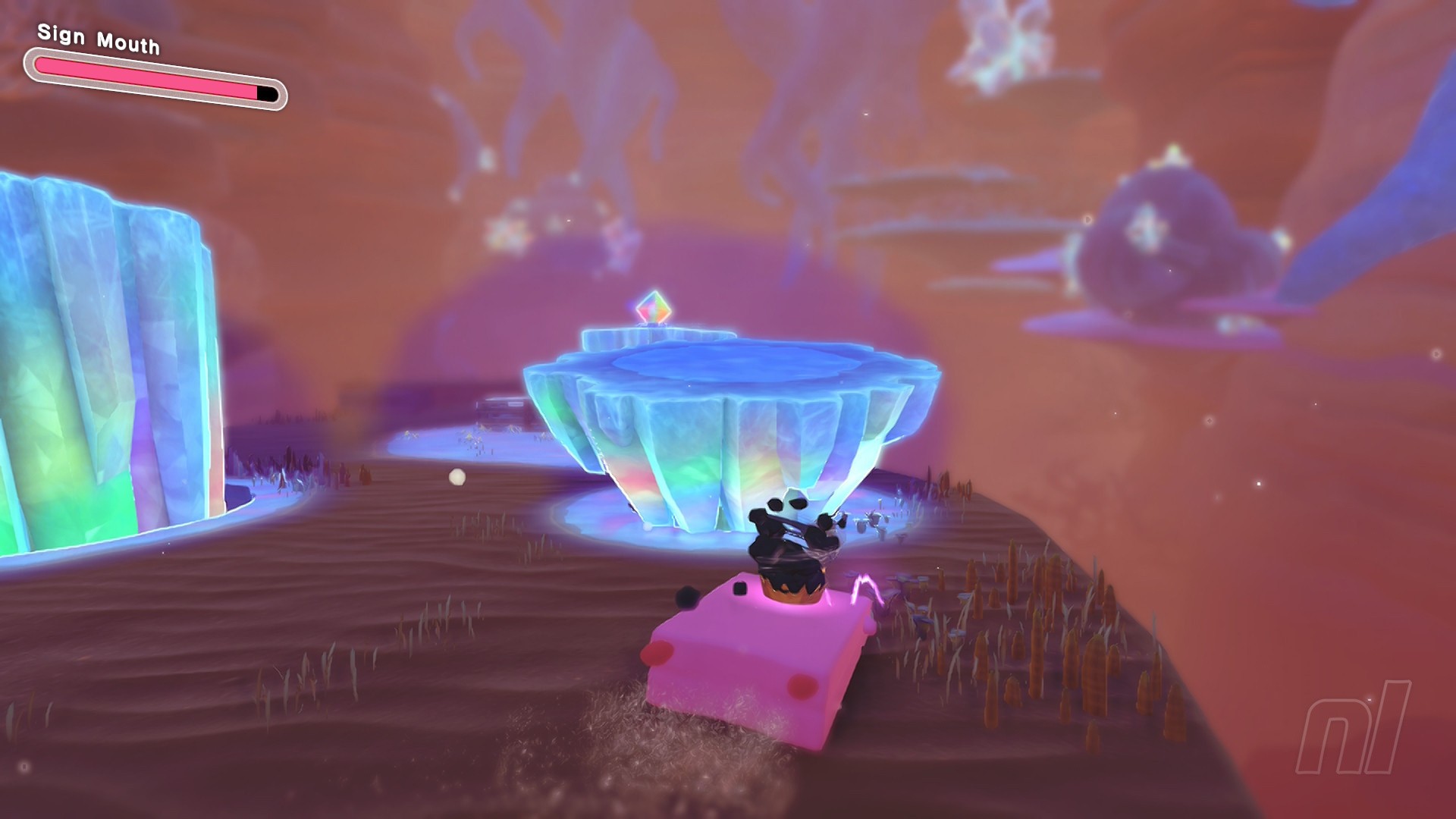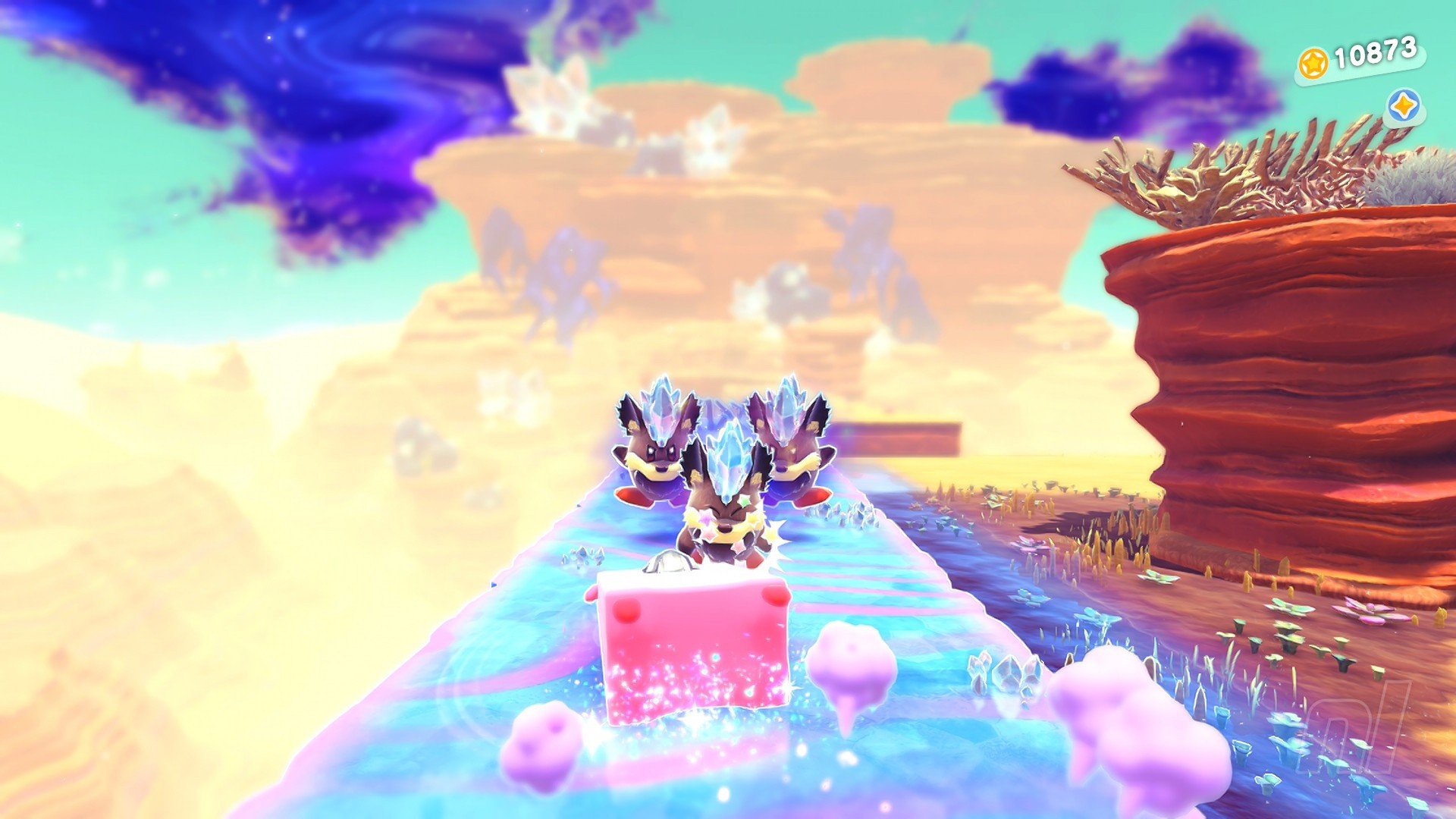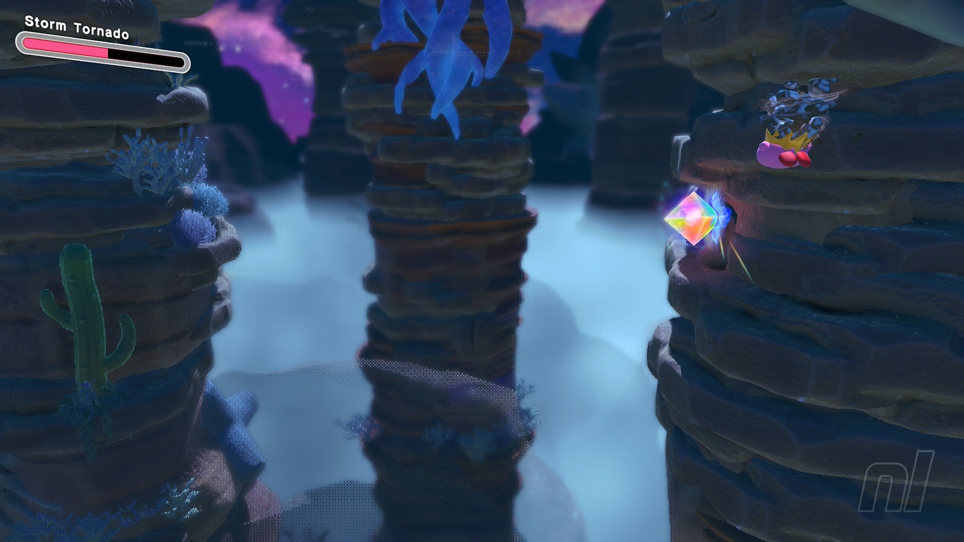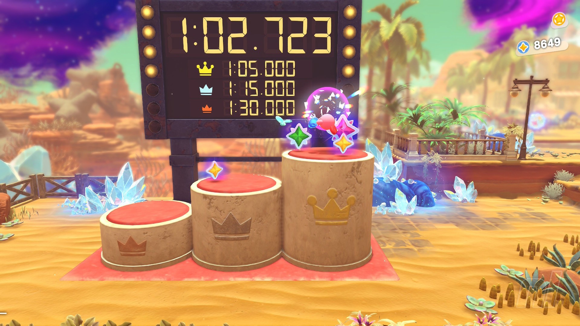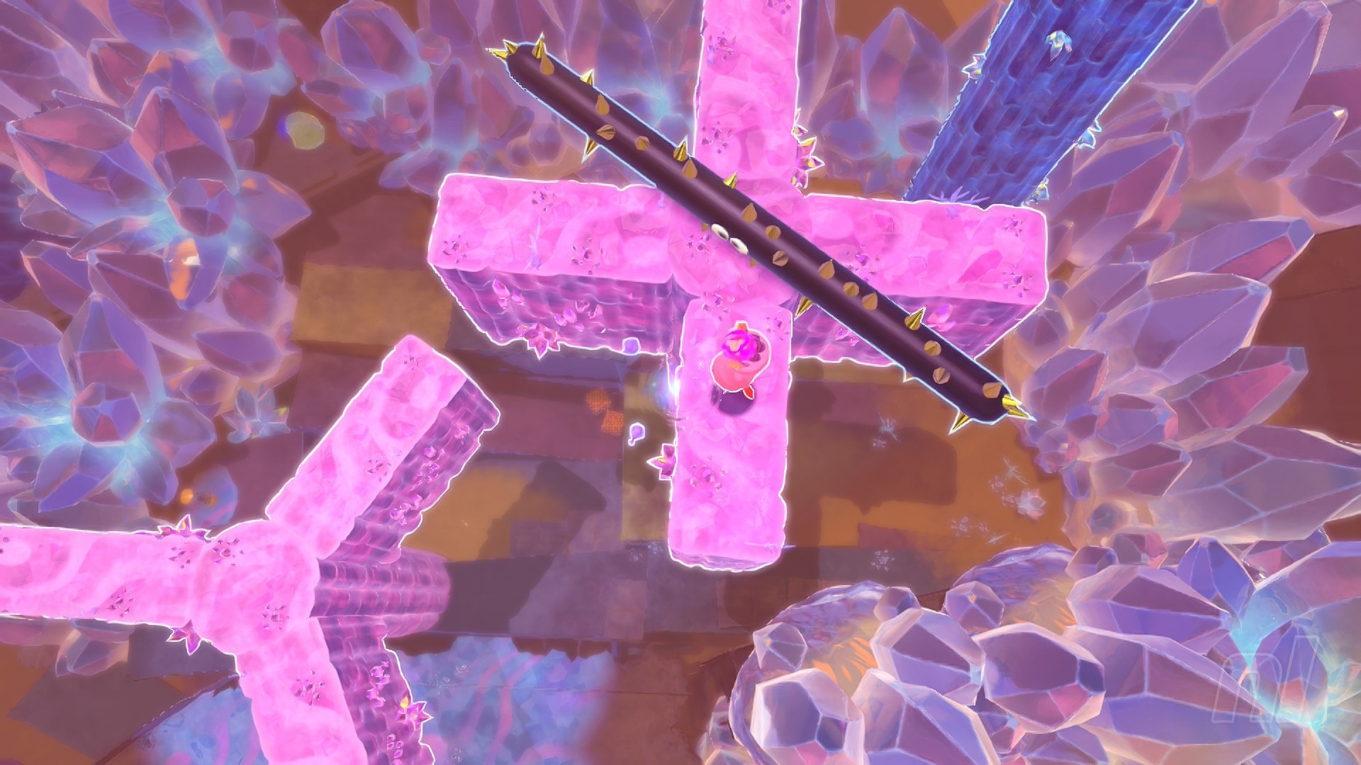 This one is more of the same, really, with a pink crystal on the other side of the open level area revealing a couple of spinning pillars to make your way up. Get to the top in time to grab this Starry.