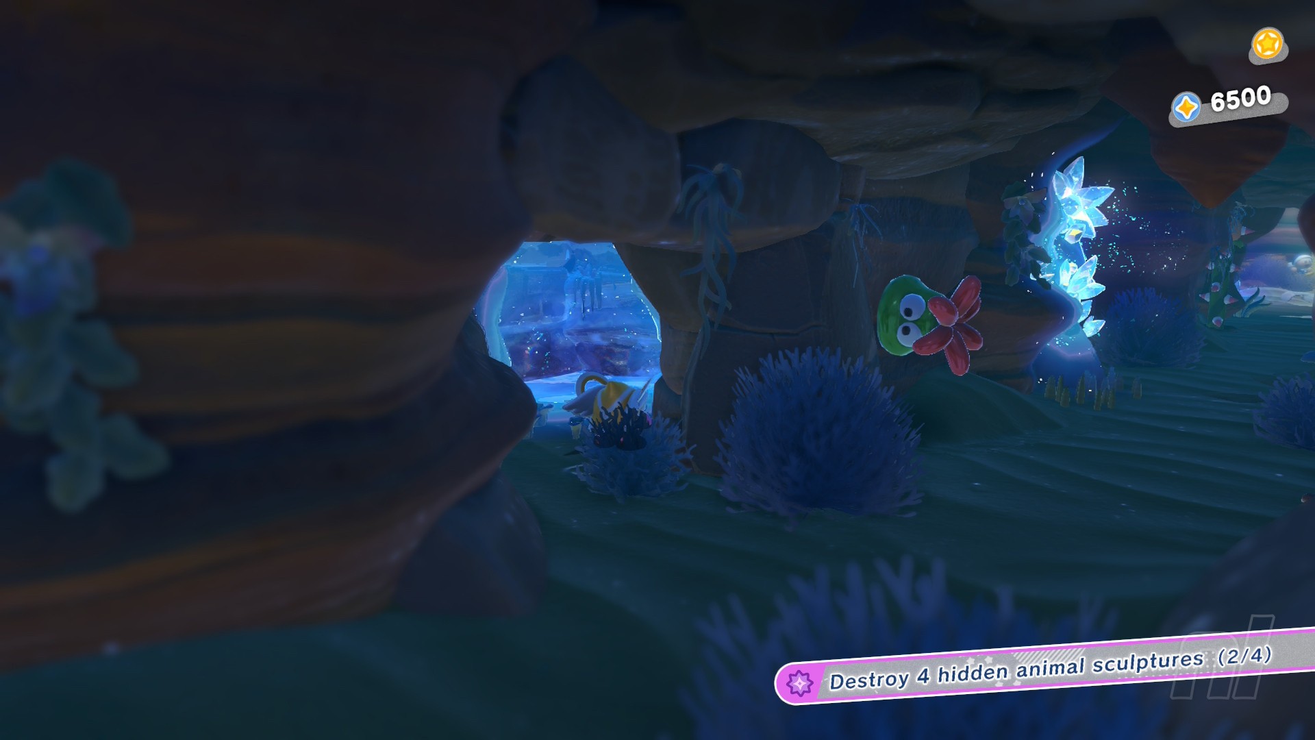 The first animal sculpture can be found as you clear out the enemies from the first area inside the cave. Head to the left, hitting any crystals as you go to reveal icy steps up and into a blocked-off area. As you go to drop back down from here after collecting some snacks, there's an ice statue to break.