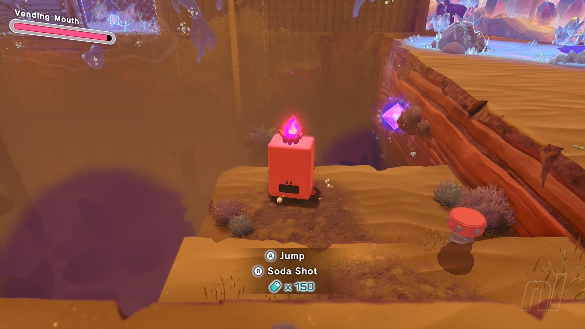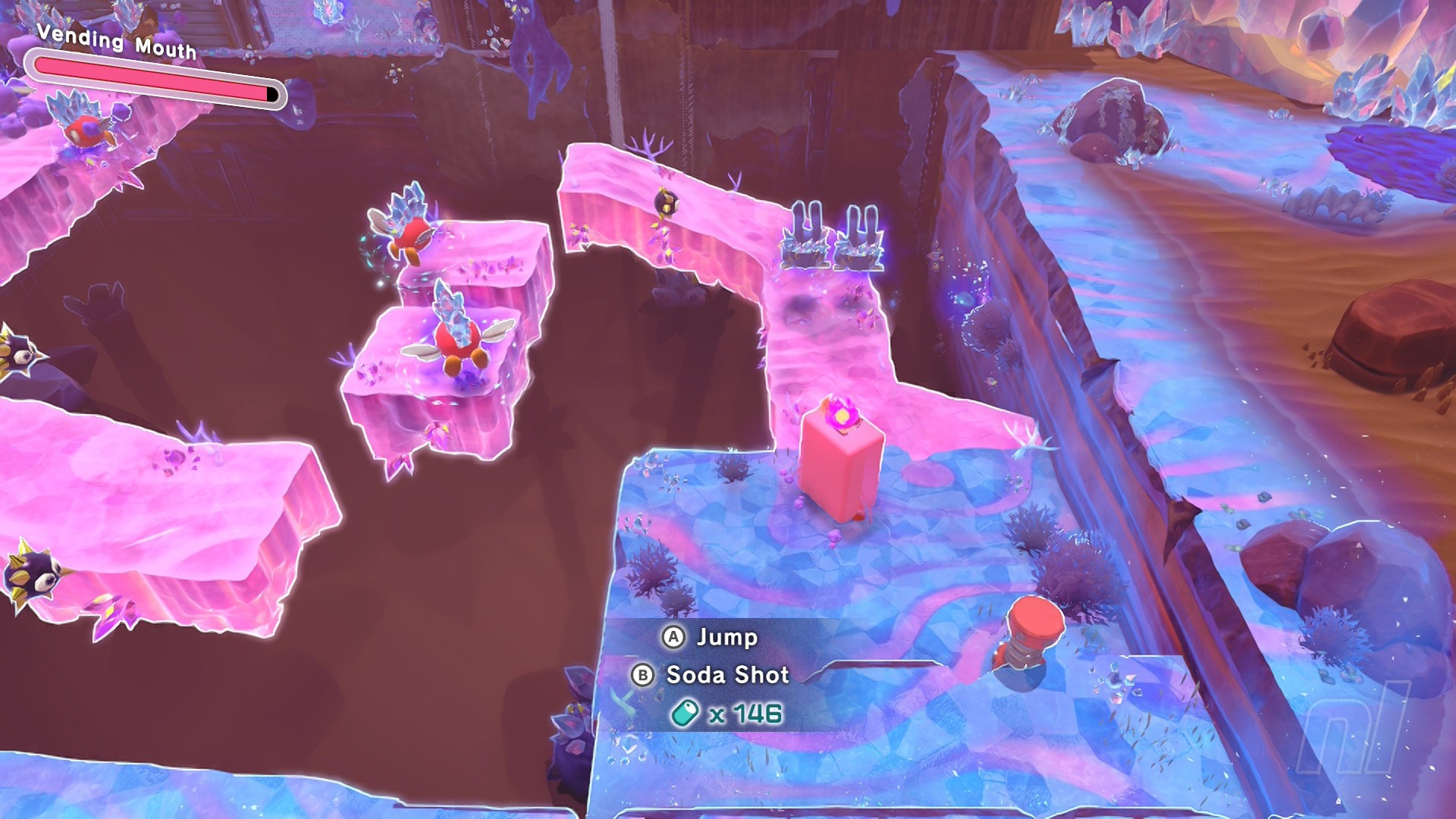 The next one involves you taking the form of a vending machine, just like the good old days. Shoot your can at the first pink crystal just ahead of you here, and then run the gauntlet, shooting foes and trying not to slip off the edges! Get to the end and shoot out the metal door to nab this beauty.