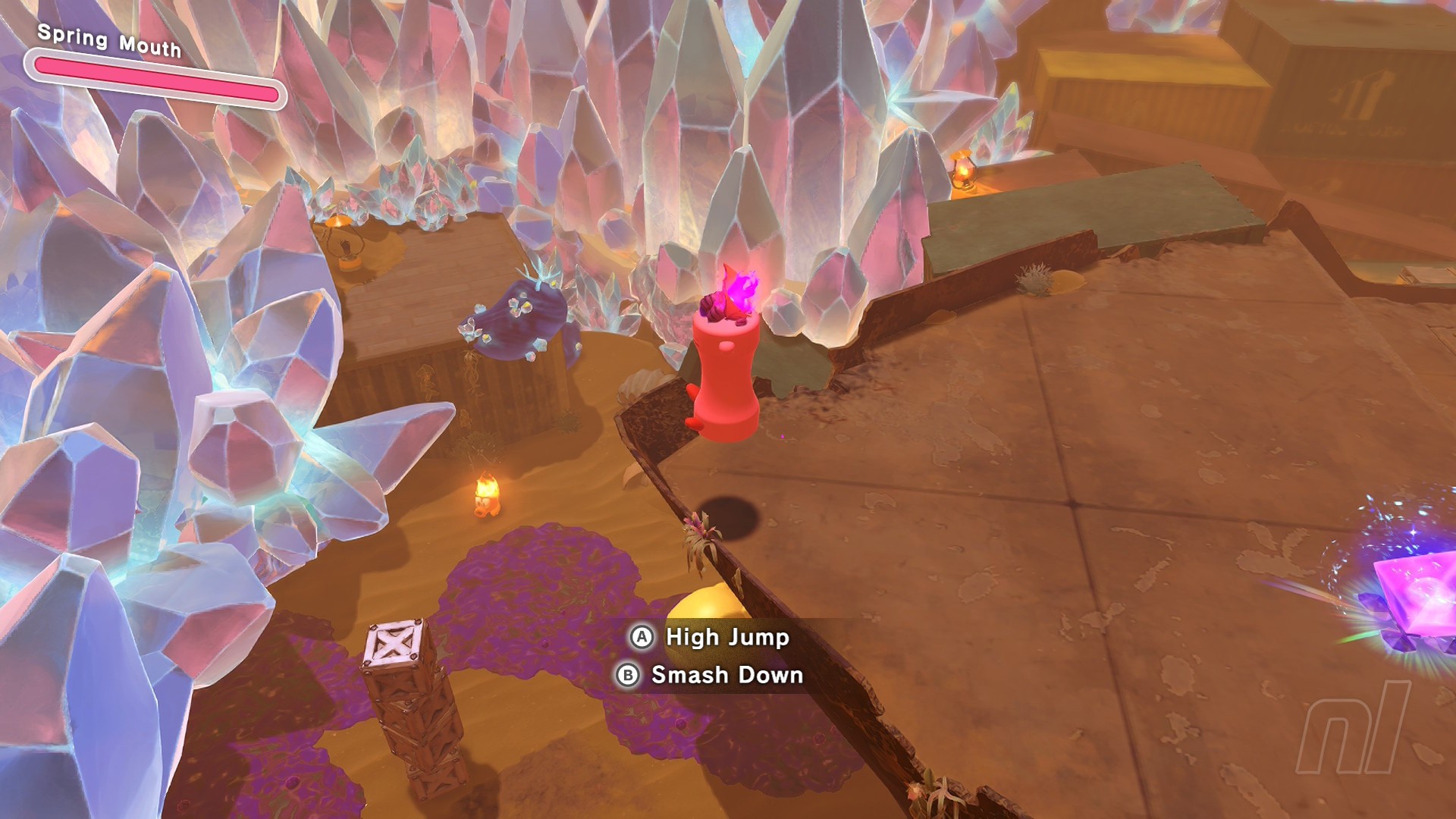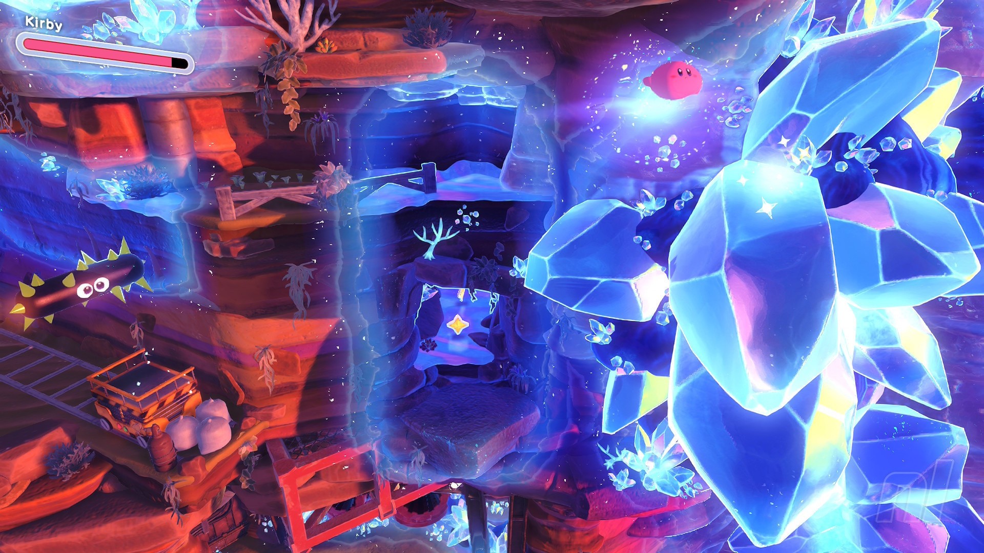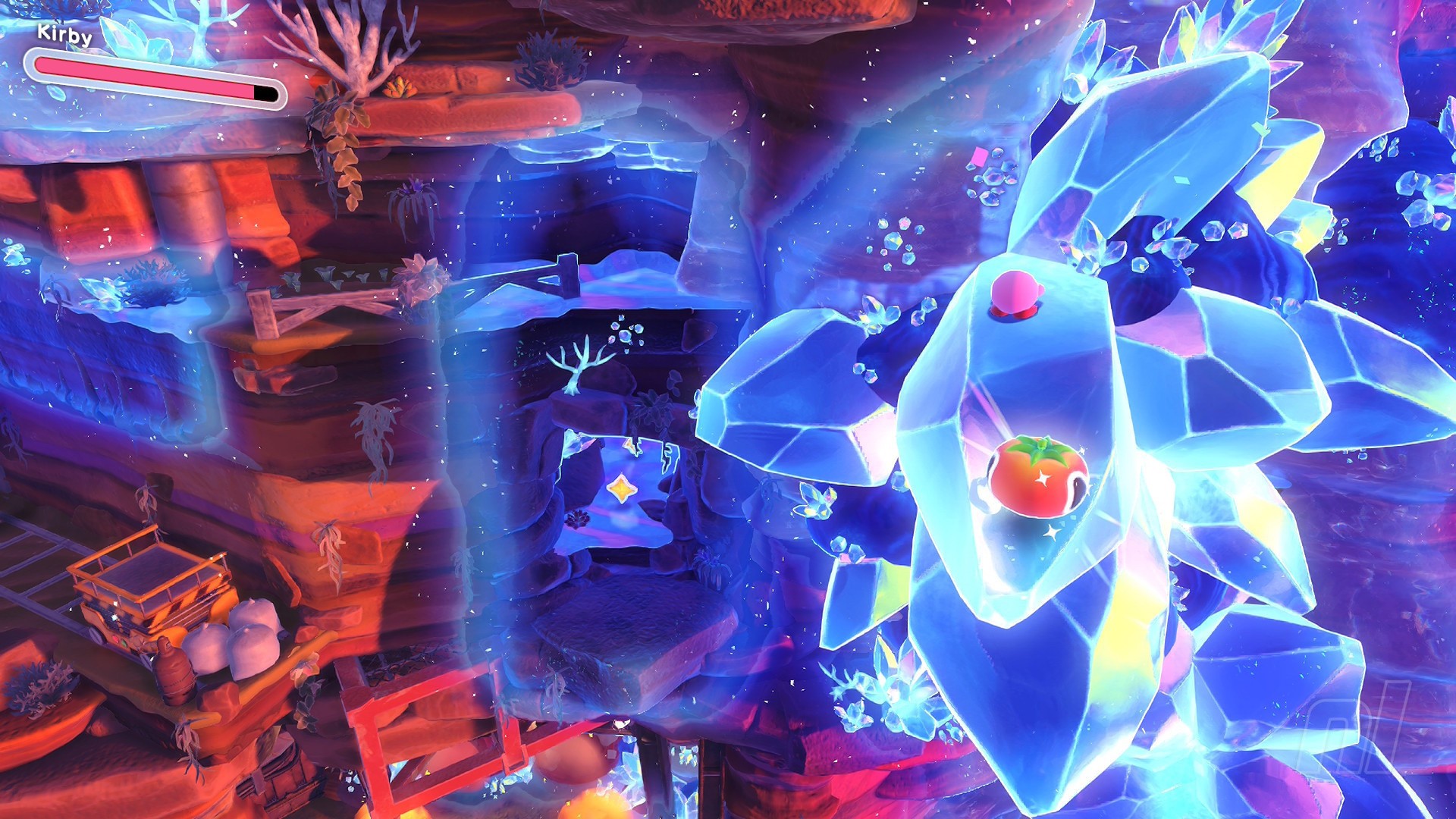 To nab this one, you'll need to head to the right and get on top of the large crystal to the immediate right of the door at the start of the level. Get up to where you found the first starry, before you jump back down, simply hover over and land on the shiny spot to have the Maxim Tomato pop out!