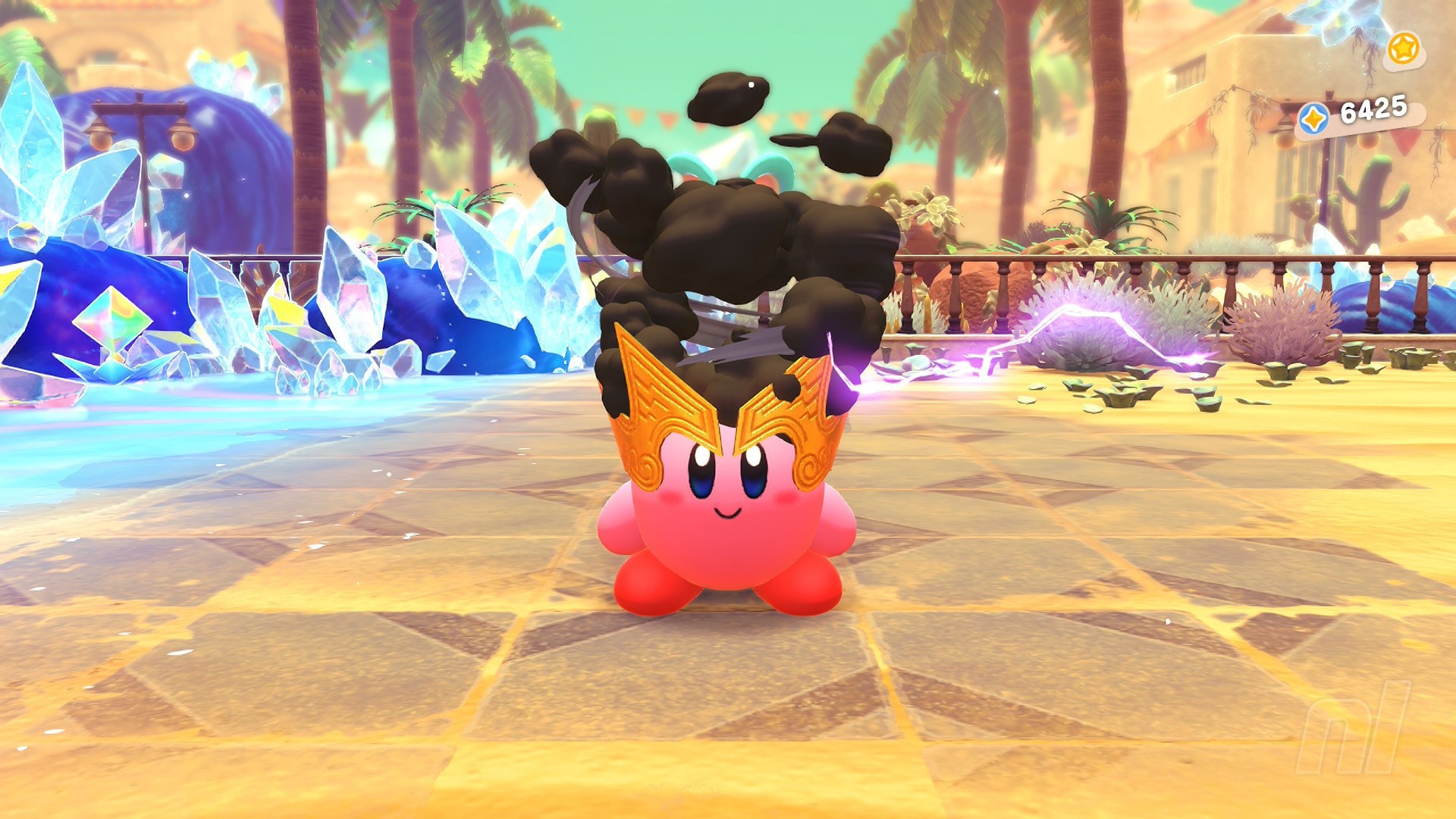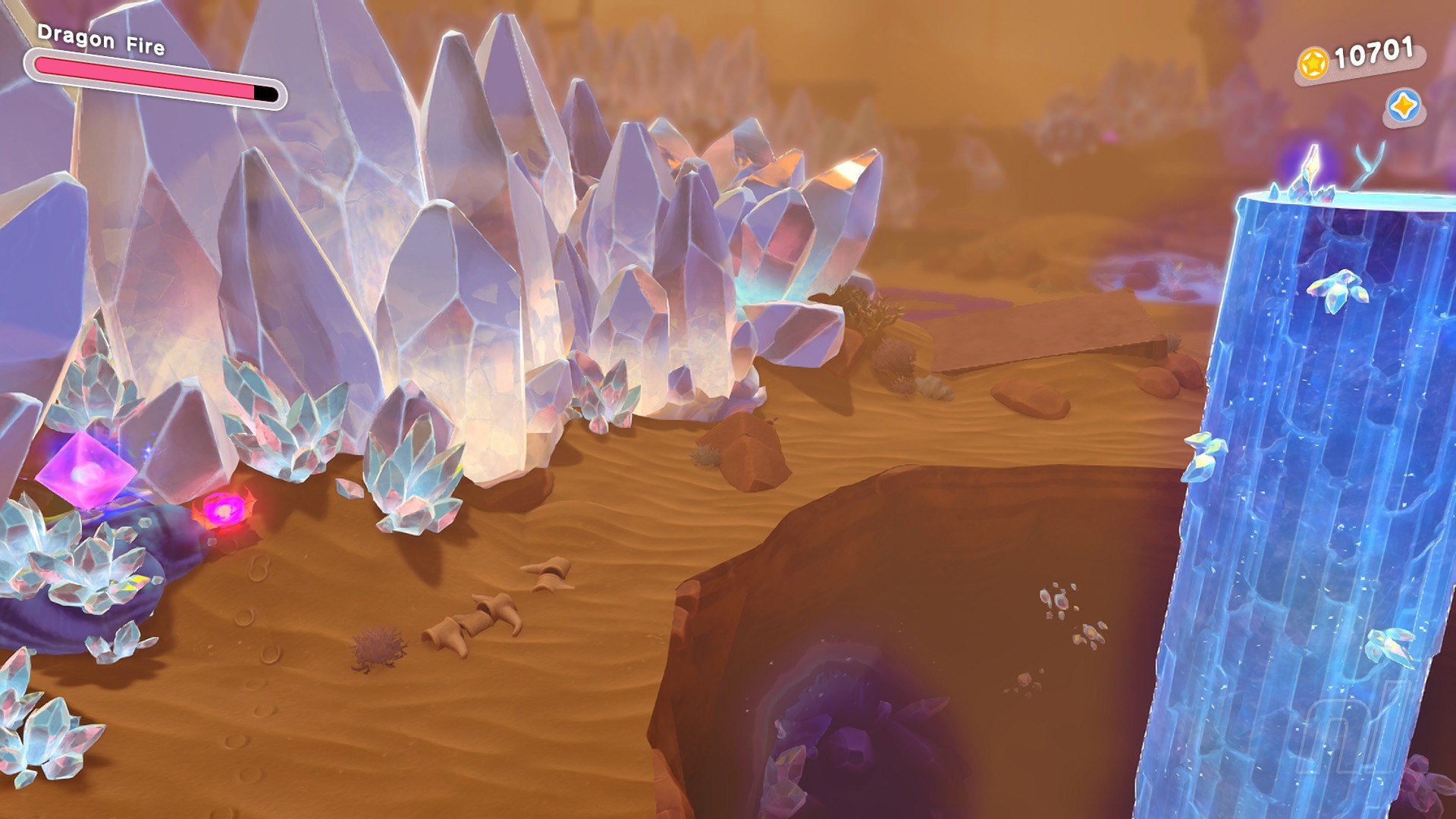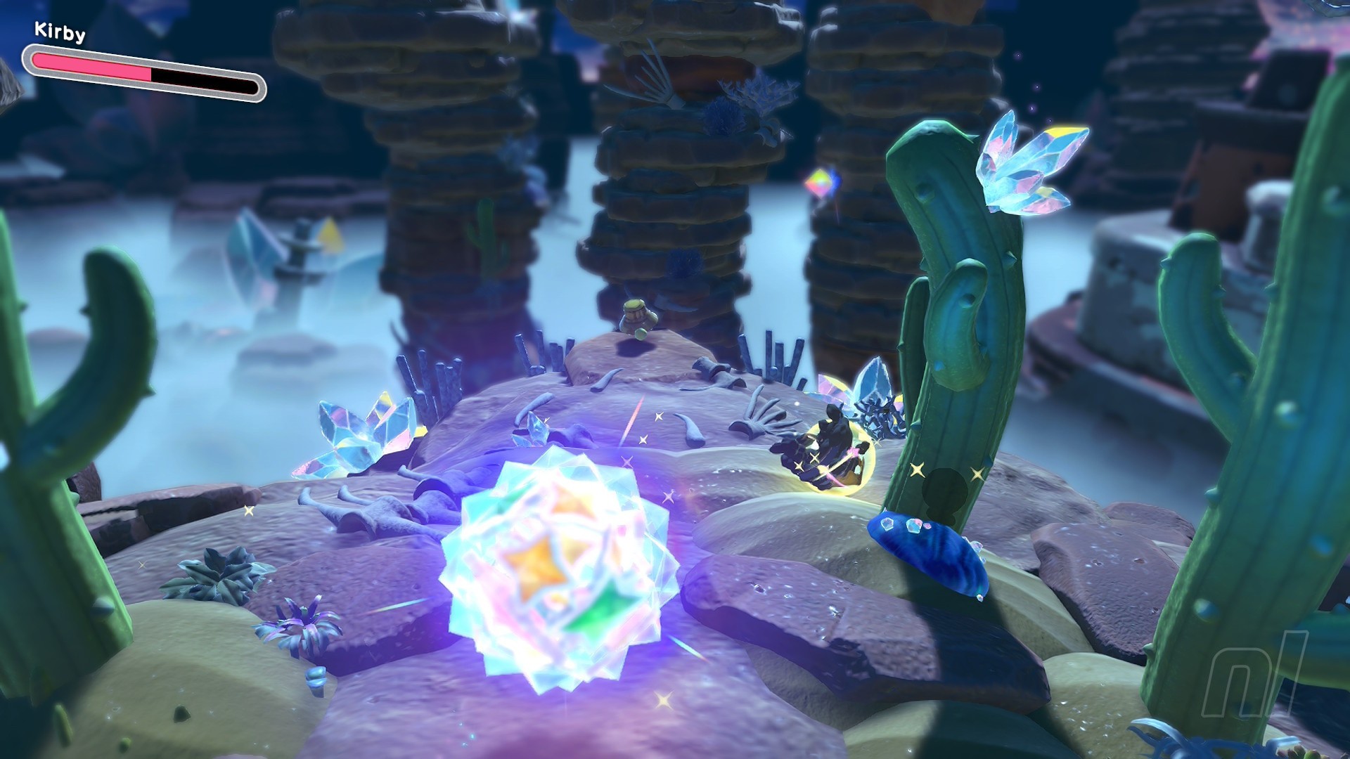 To nab this one, you'll need to head to the right and get on top of the large crystal to the immediate right of the door at the start of the level. Get up to where you found the first starry, before you jump back down, simply hover over and land on the shiny spot to have the Maxim Tomato pop out!