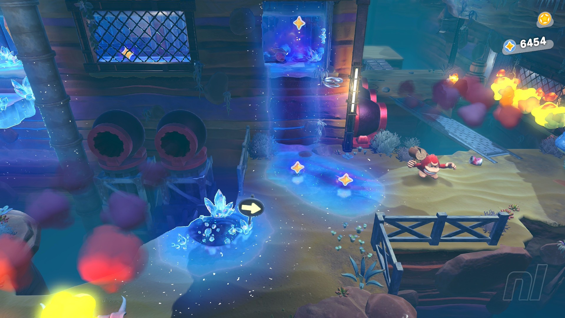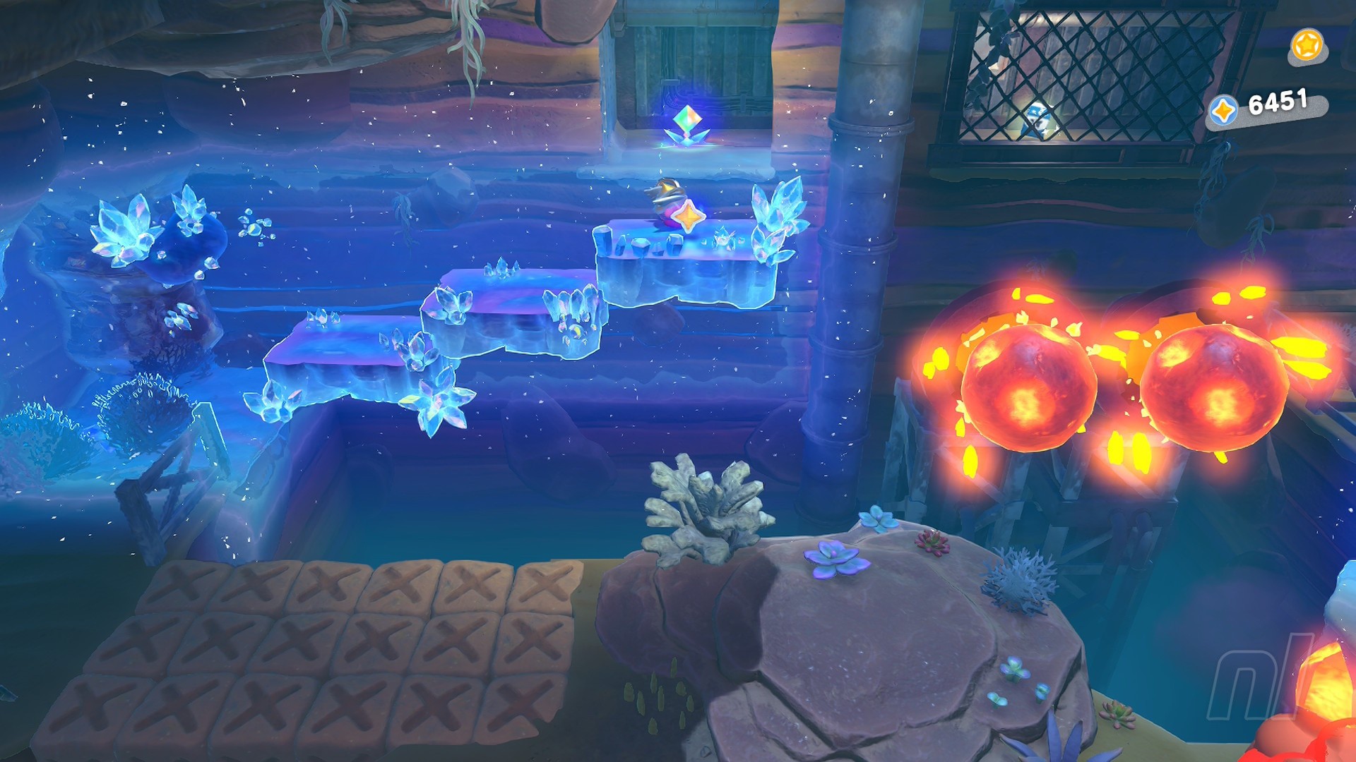 This first one is right at the start of the stage. Hit the pink crystal switch to your left, as shown below, to raise up some timed platforms. Race up these to claim Starry number one.