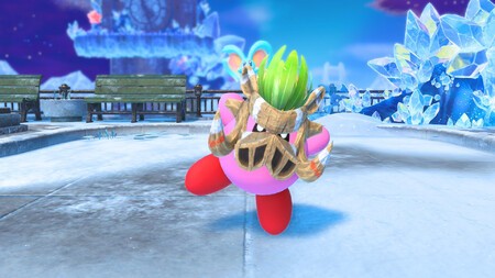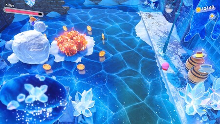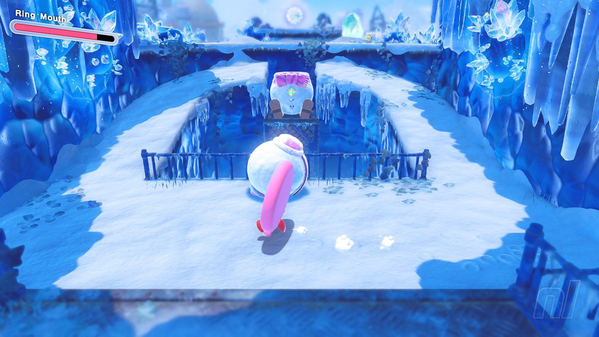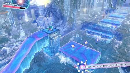 To get this first one, let's follow the opening path along, hitting all the crystals as we go. Then ride the moving ice platforms until you see the cone ability to one side. Nab it and use it to flatten the enemy at the end of the water here. Now head up the steps and destroy the floor here to nab the Starry.