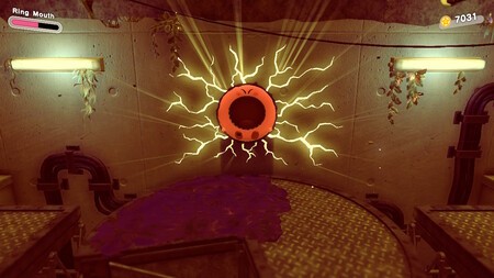 Now head left on the ship and use mouthful mode to open the sphere, hit the switch inside to reveal a path for the scissor-lift below, now ride the lift to the end and use it bash open the metal crate above you for the final piece in this area
