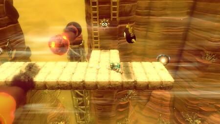 Now hit the next bomb block up here to head up once more, take out the baddies, hit the bomb block behind them and make your way across the windy platform to drop down on top of the next piece which you can see below